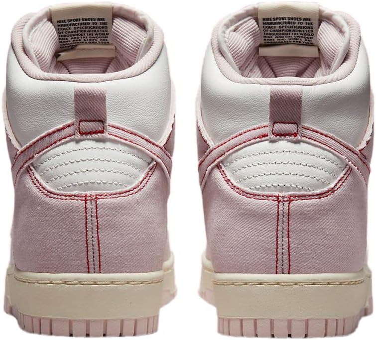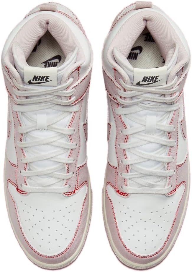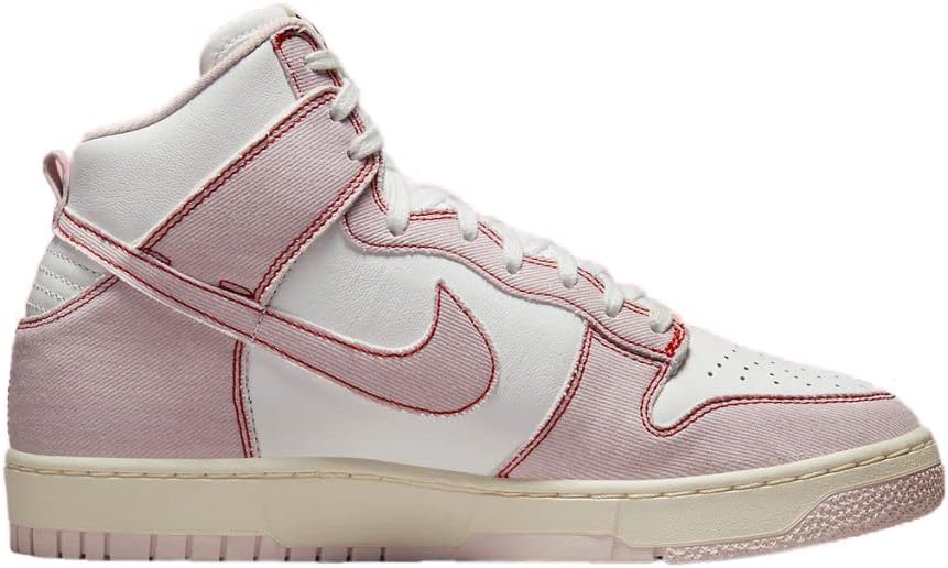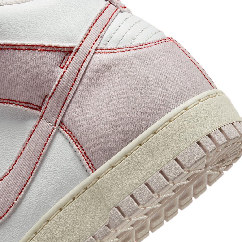 Dunk High 1985 года выпуска. Верх из кожи. Джинсовая накладка. Перфорированный носок. Тканая нашивка Nike на язычке. Галочка сбоку. Прошитый изгиб сзади. Плоские хлопковые шнурки. Резиновая подошва. Модель: nkdq8799-100. Цвет: Белый, едва розовый, красный. Материал: кожа.