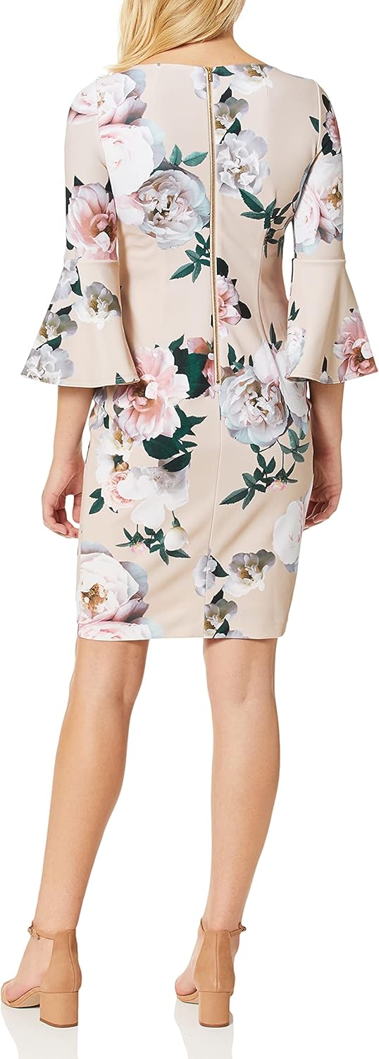 Это женское платье-футляр Calvin Klein - это базовый облегающий рабочий костюм из крепа Scuba с рукавами-колокольчиками.