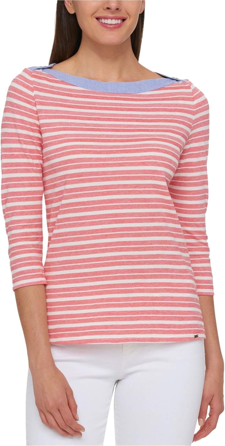 Футболка Tommy Hilfiger J7SHN287, базовая, Китай, женская, с вырезом-лодочкой, не указано, 100% Хлопок, в полоску, всесезонная, средней плотности, рукав 3/4, повседневная, современная. Дополнительные детали: трехцветная повседневная футболка с рукавом три четверти ||Вырез из шамбре с пуговицами на плечах ||Пуловер с вырезом-лодочкой ||Полосатый узор по всей длине