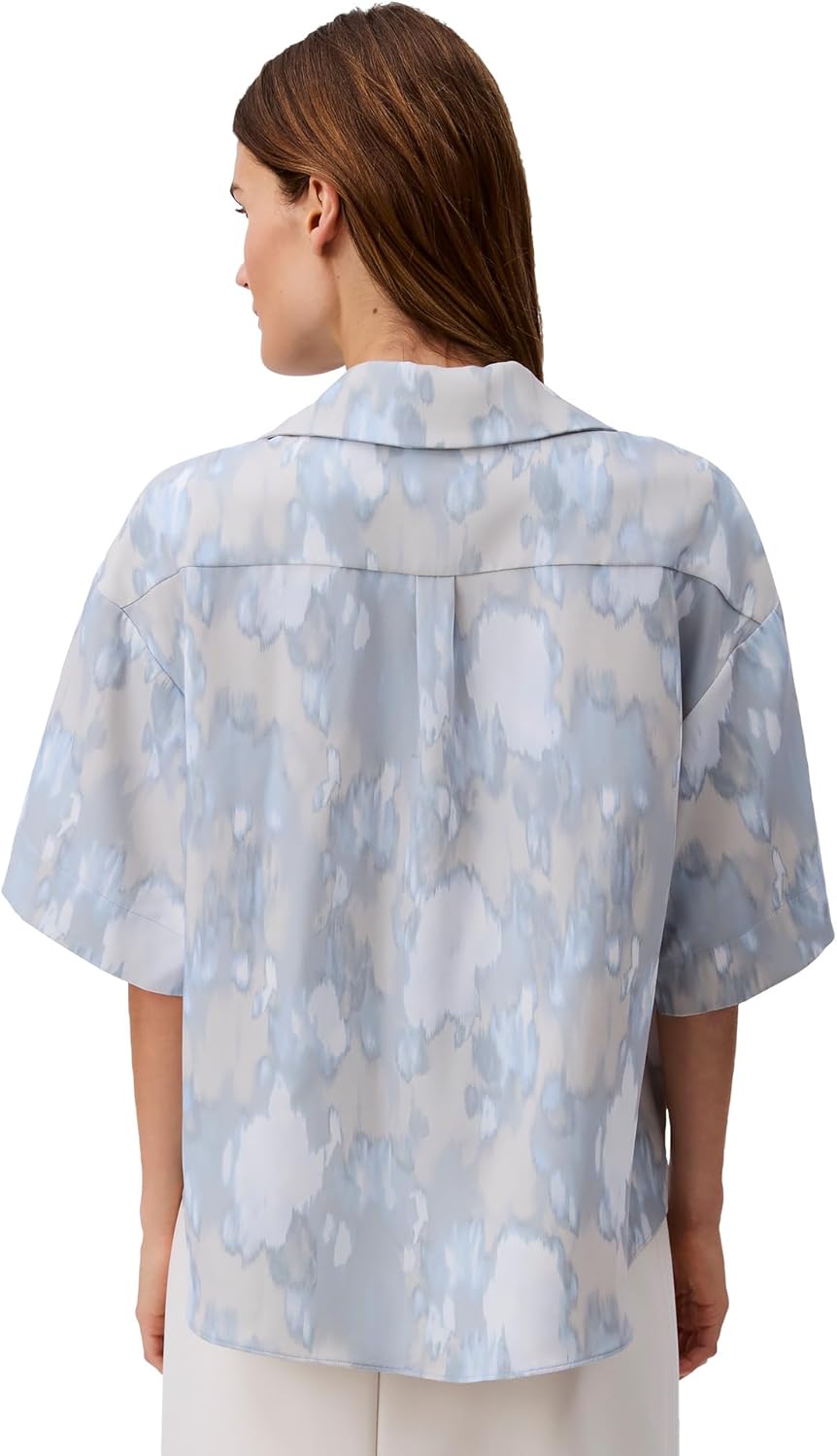 Этот топ из гладкого крепа имеет свободную драпировку. Отложной воротник открывает линию горловины.
