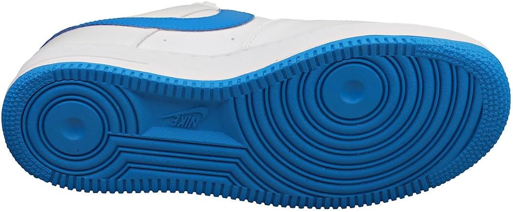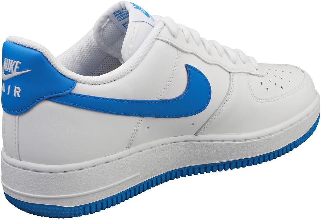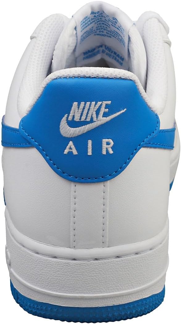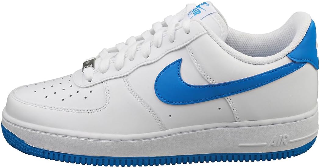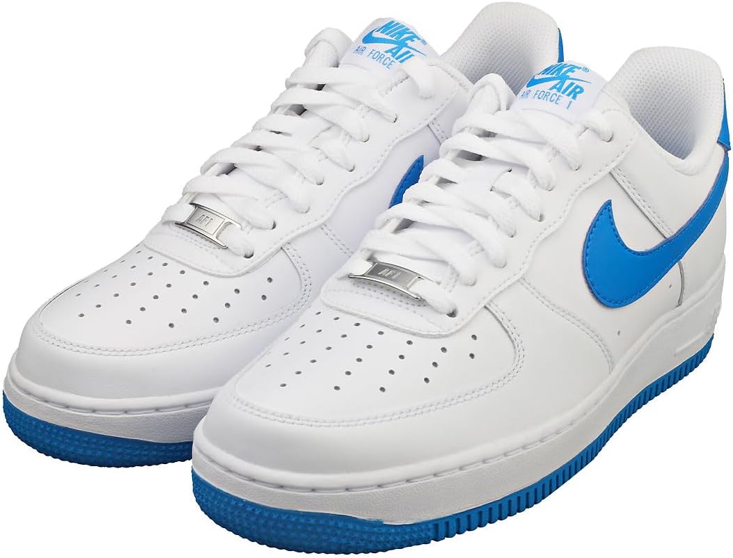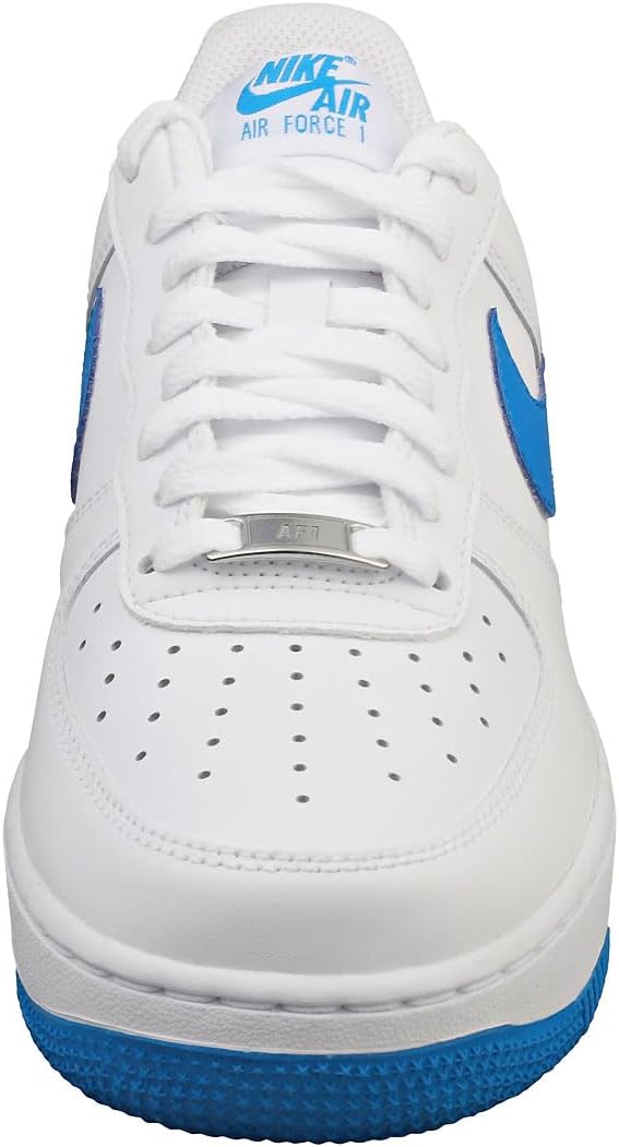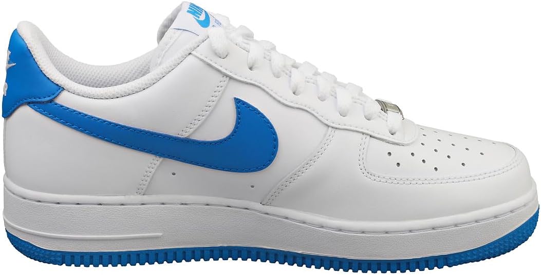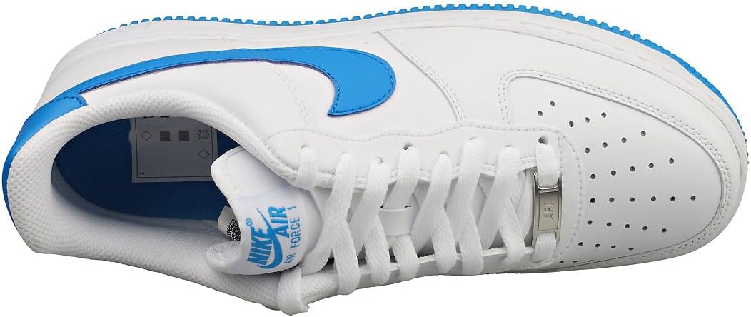 Эти кроссовки Nike Air Force 1 Low выполнены из белой кожи и дополнены сетчатыми язычками в тон. Преимущественно белый верх дополнен акцентами цвета Photo Blue, которые можно увидеть на логотипах Swoosh, накладках на пятке, брендинге язычка, стельках и резиновой подошве. Среди других примечательных особенностей дизайна - серебристо-металлические шнурки и белый брендинг Nike на стельках и накладках на пятке.