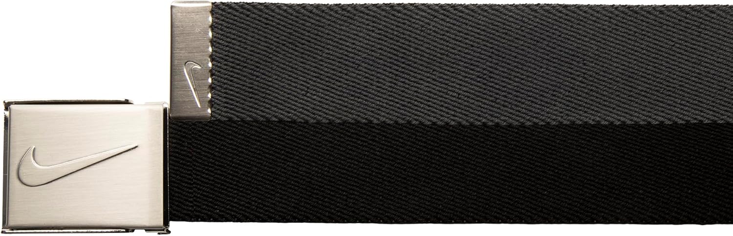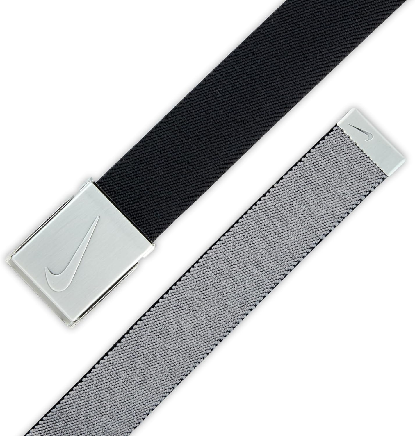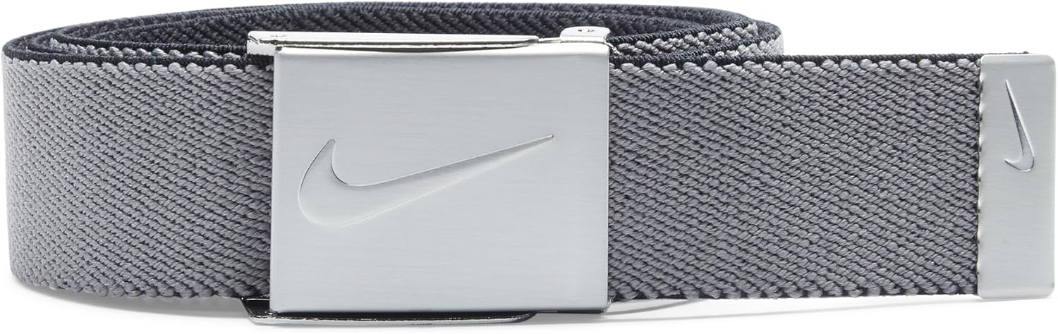 Эластичная тесьма, переходящая во второй цвет, пряжка из матового серебра с рельефным логотипом «свуш», технология NIKE Stretch & Custom fit, технология двусторонней посадки NIKE, ширина 38 мм