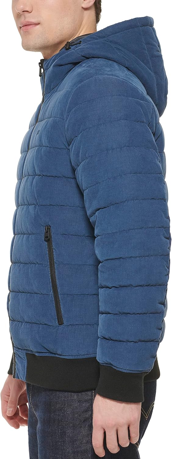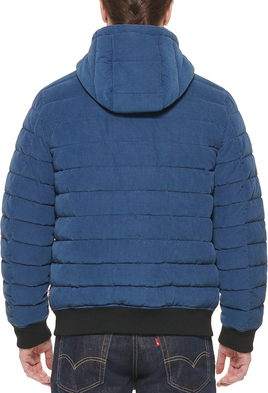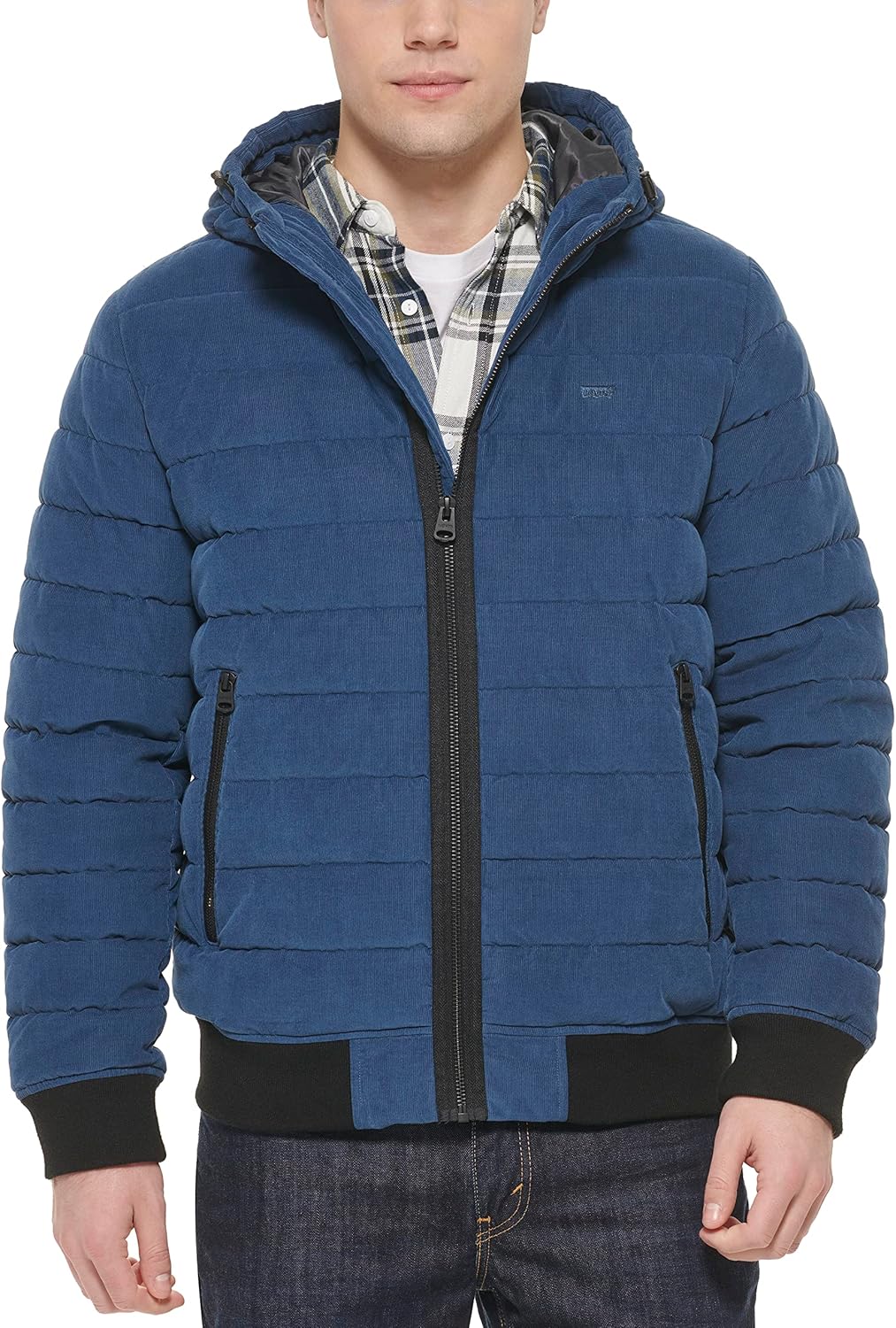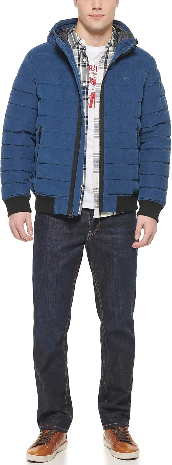 Стеганая вельветовая куртка-бомбер из ветроустойчивого эластичного полиэстера, застежка-молния по центру спереди, регулируемый капюшон на шнурке, трикотажные манжеты и подол в рубчик, классическая вышивка Levi's в виде крыла летучей мыши на левой стороне груди, два нижних прорезных кармана на молнии и один внутренний прорезной карман на молнии.