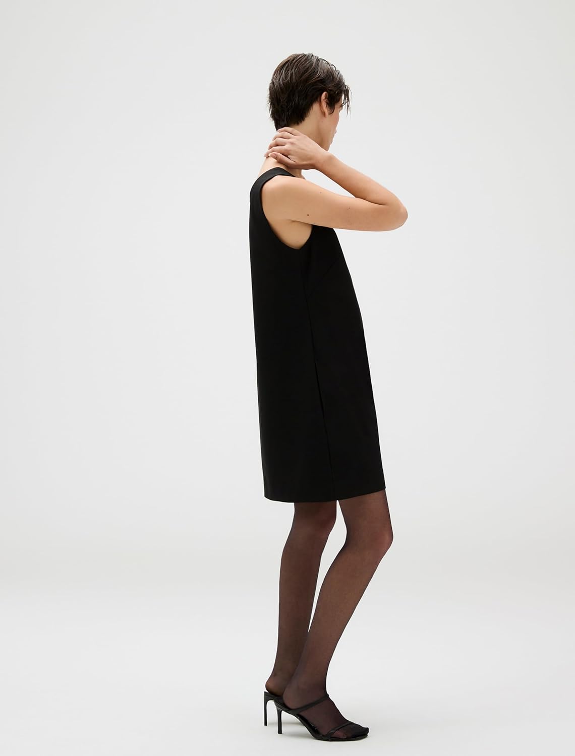 Это мини-платье А-силуэта не мнется и выполнено из ткани, тянущейся в четырех направлениях, что обеспечивает свободу движений. Модель с круглым вырезом и карманами в швах по бокам.