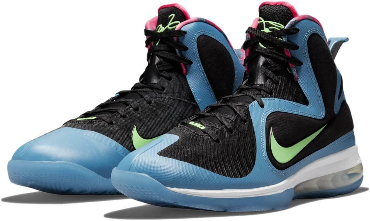 Летние кроссовки South Coast 9s представлены в элегантном черно-синем дизайне с зеленой и розовой тропической стелькой. Вдохновленные оригинальными моделями 2011 года, кроссовки оснащены технологиями Nike Hyperfuse и Flywire, вставкой Zoom Air в передней части стопы и видимой вставкой Max Air в области пятки. Образ дополняют белая межподошва, синяя полупрозрачная подошва и графичные стельки.