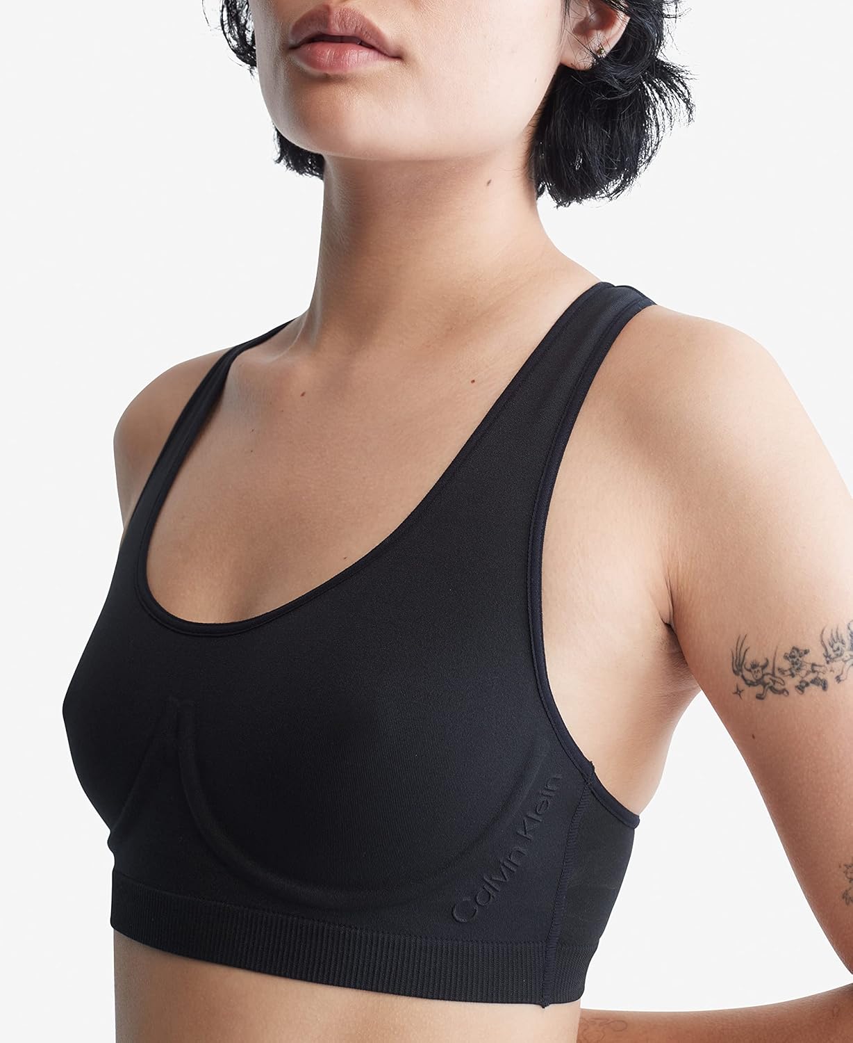 Эволюция комфорта. Этот бюстгальтер-бралетт Calvin Klein без подкладки с улучшенной поддержкой и бесшовным трикотажем из переработанных материалов тонкого переработанного переплетения создан, чтобы повторять ваши движения. Эластичный материал обеспечивает длительный комфорт, дополнен технологией поддержки из пеноматериала без косточек, полностью регулируемыми бретельками с логотипом и вышитым логотипом в тон для создания изысканного фирменного стиля.
