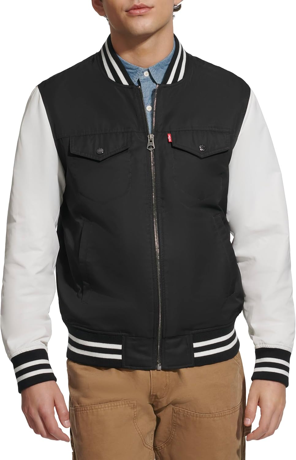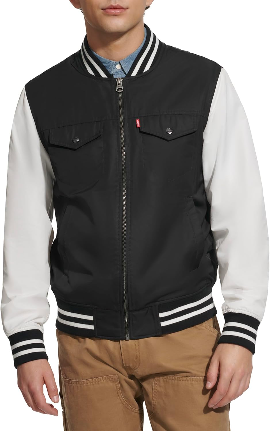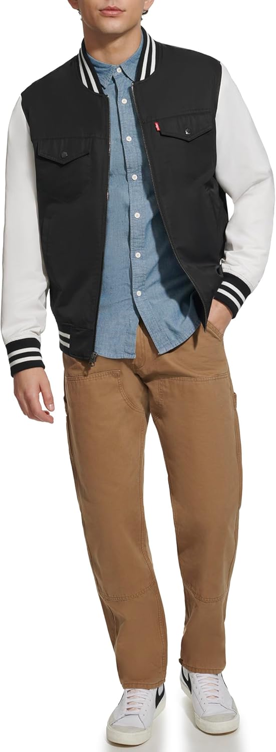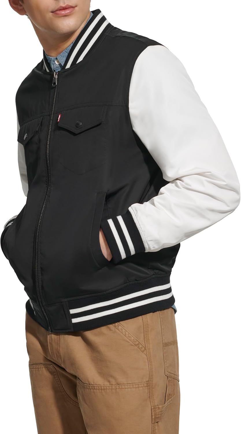 Куртка-бомбер в университетском стиле с капюшоном. Множество отделений для хранения вещей. Два верхних нагрудных кармана с застежкой на кнопку, два нижних прорезных кармана на молнии и один внутренний карман для безопасности. Застежка на молнию по центру спереди. Контрастная трикотажная резинка на манжетах и подоле для комфорта. Водонепроницаемая внешняя ткань. Фирменная нашивка Levi's на верхнем левом нагрудном кармане, нашивка Levi's с надписью «73» на правом рукаве и круглая нашивка с логотипом Levi's на левом рукаве.