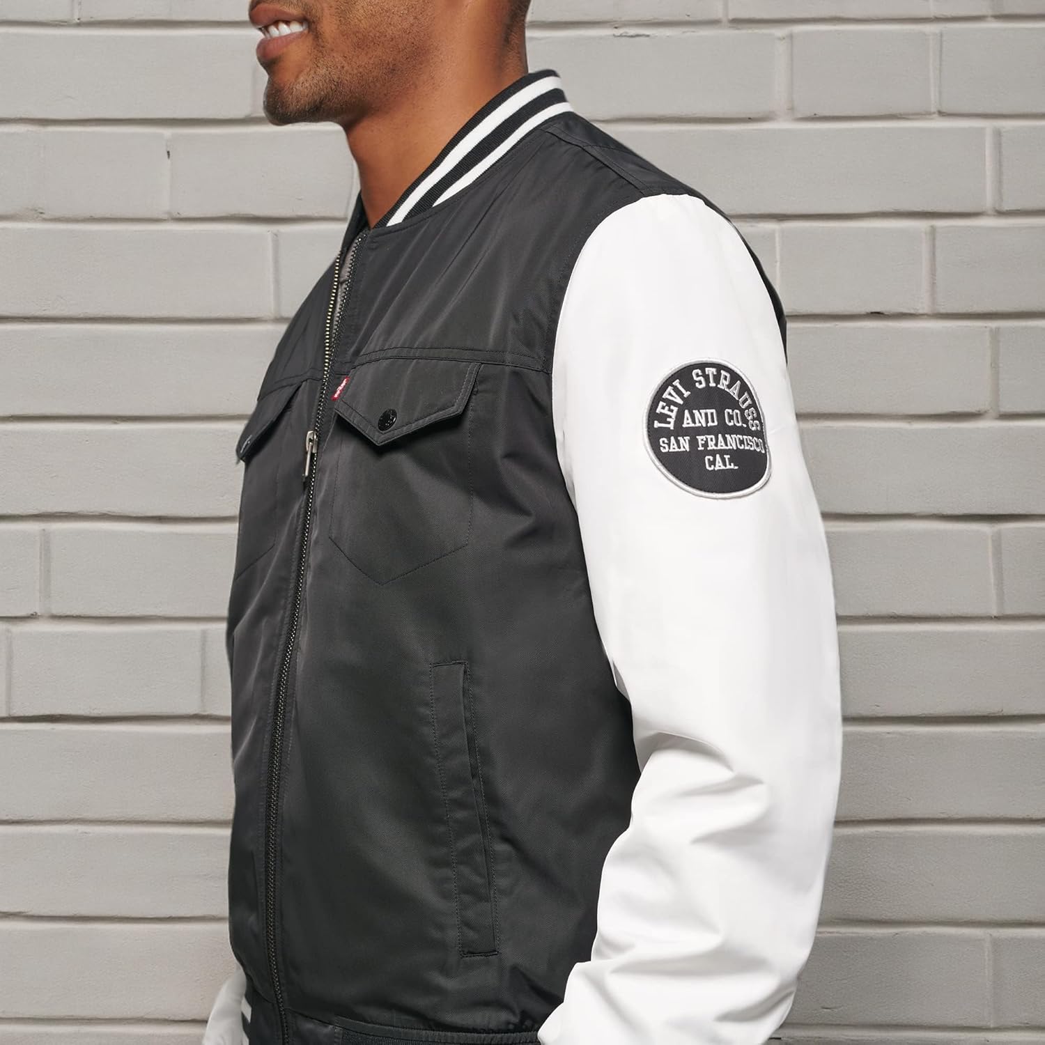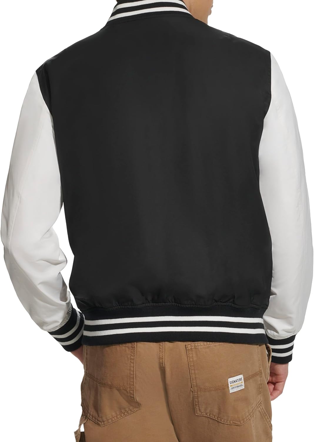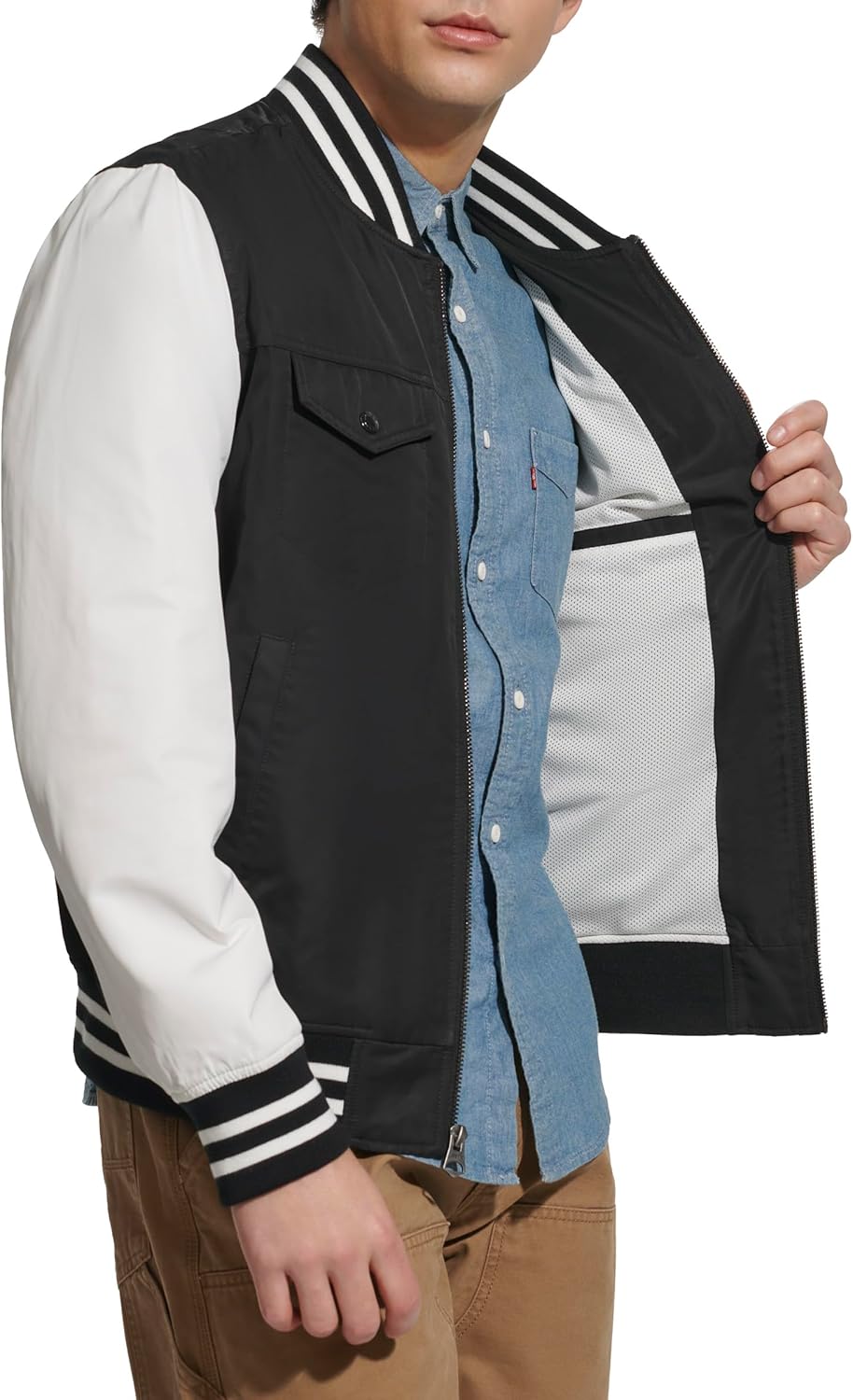 Куртка-бомбер в университетском стиле с капюшоном. Множество отделений для хранения вещей. Два верхних нагрудных кармана с застежкой на кнопку, два нижних прорезных кармана на молнии и один внутренний карман для безопасности. Застежка на молнию по центру спереди. Контрастная трикотажная резинка на манжетах и подоле для комфорта. Водонепроницаемая внешняя ткань. Фирменная нашивка Levi's на верхнем левом нагрудном кармане, нашивка Levi's с надписью «73» на правом рукаве и круглая нашивка с логотипом Levi's на левом рукаве.