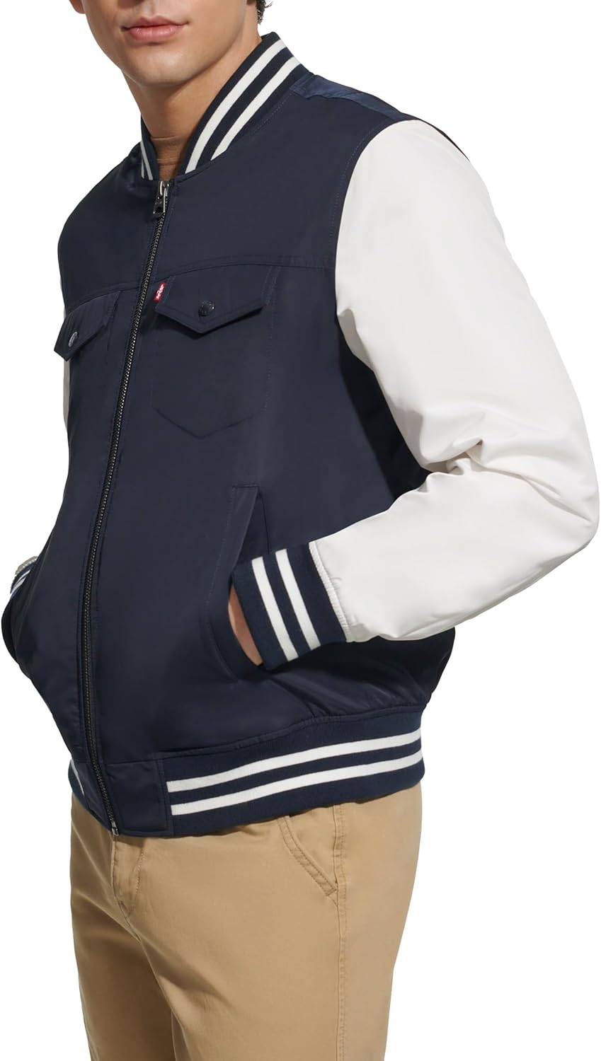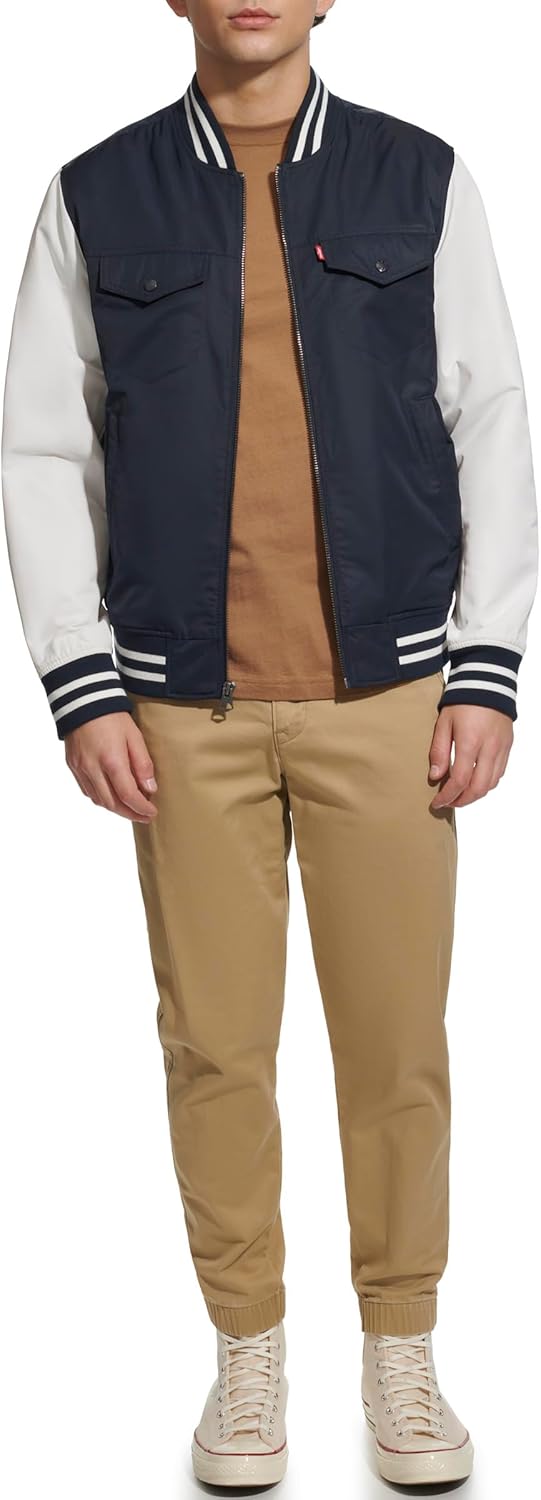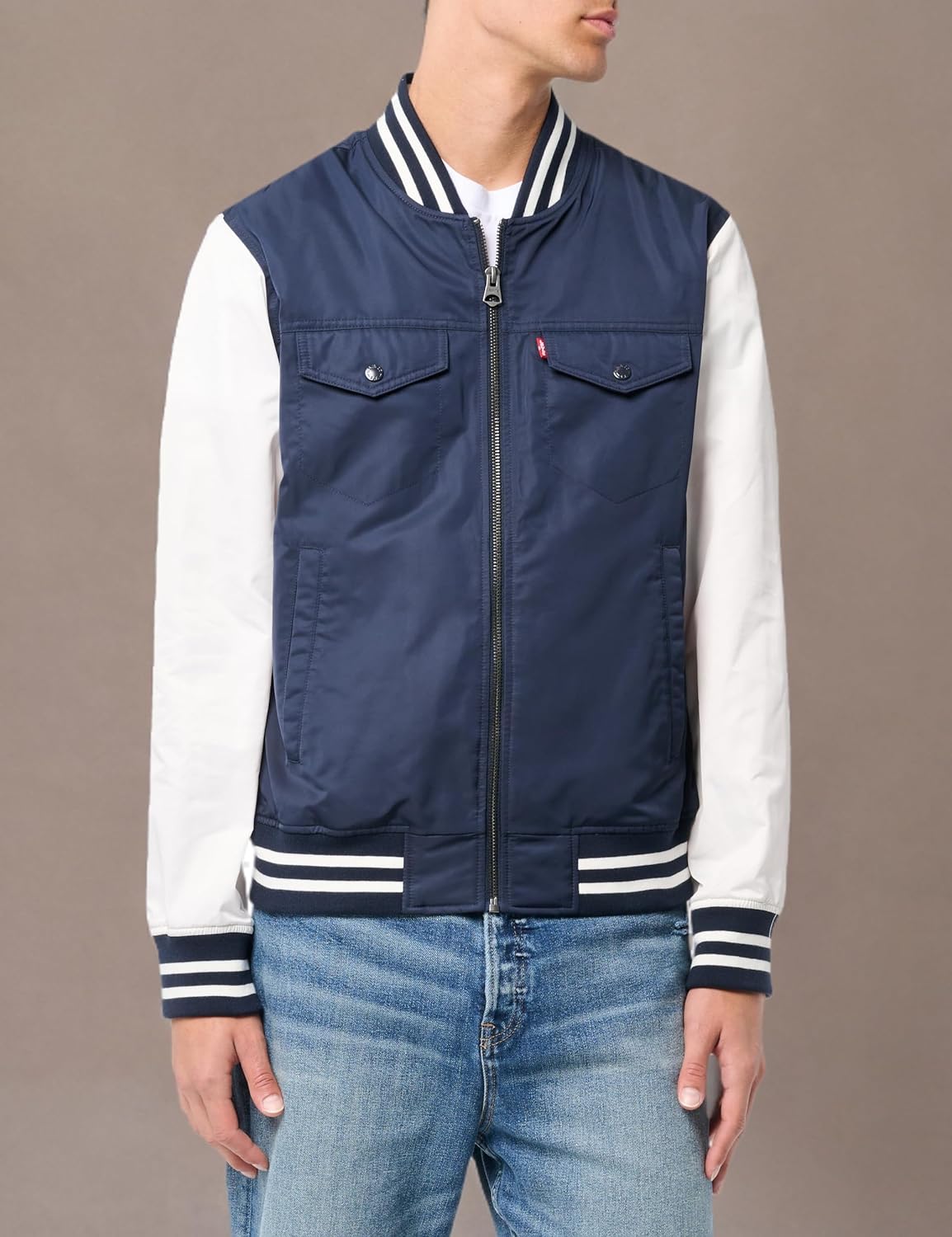 Куртка-бомбер в университетском стиле с капюшоном. Множество отделений для хранения вещей. Два верхних нагрудных кармана с застежкой на кнопку, два нижних прорезных кармана на молнии и один внутренний карман для безопасности. Застежка на молнию по центру спереди. Контрастная трикотажная резинка на манжетах и подоле для комфорта. Водонепроницаемая внешняя ткань. Фирменная нашивка Levi's на верхнем левом нагрудном кармане, нашивка Levi's с надписью «73» на правом рукаве и круглая нашивка с логотипом Levi's на левом рукаве.