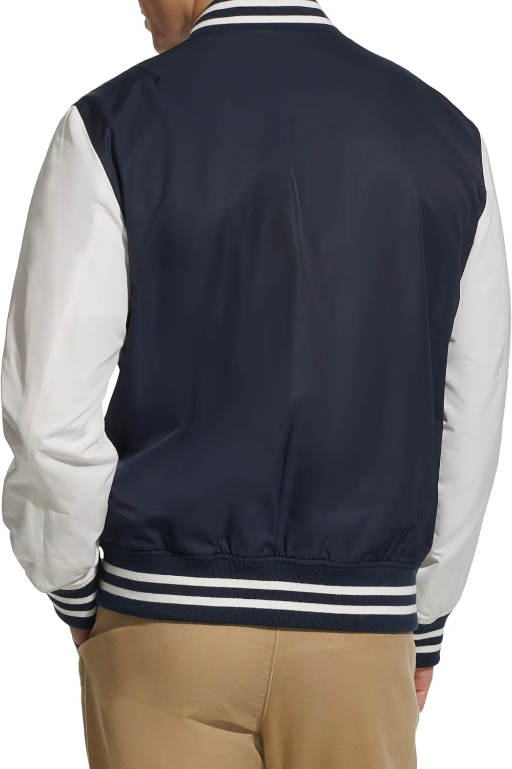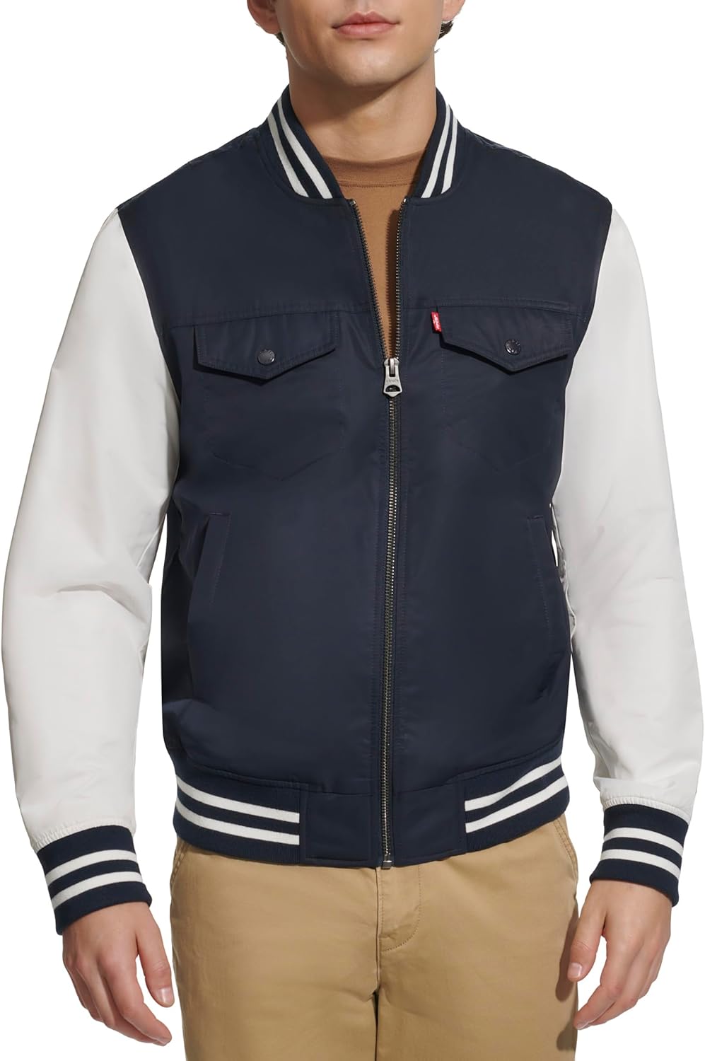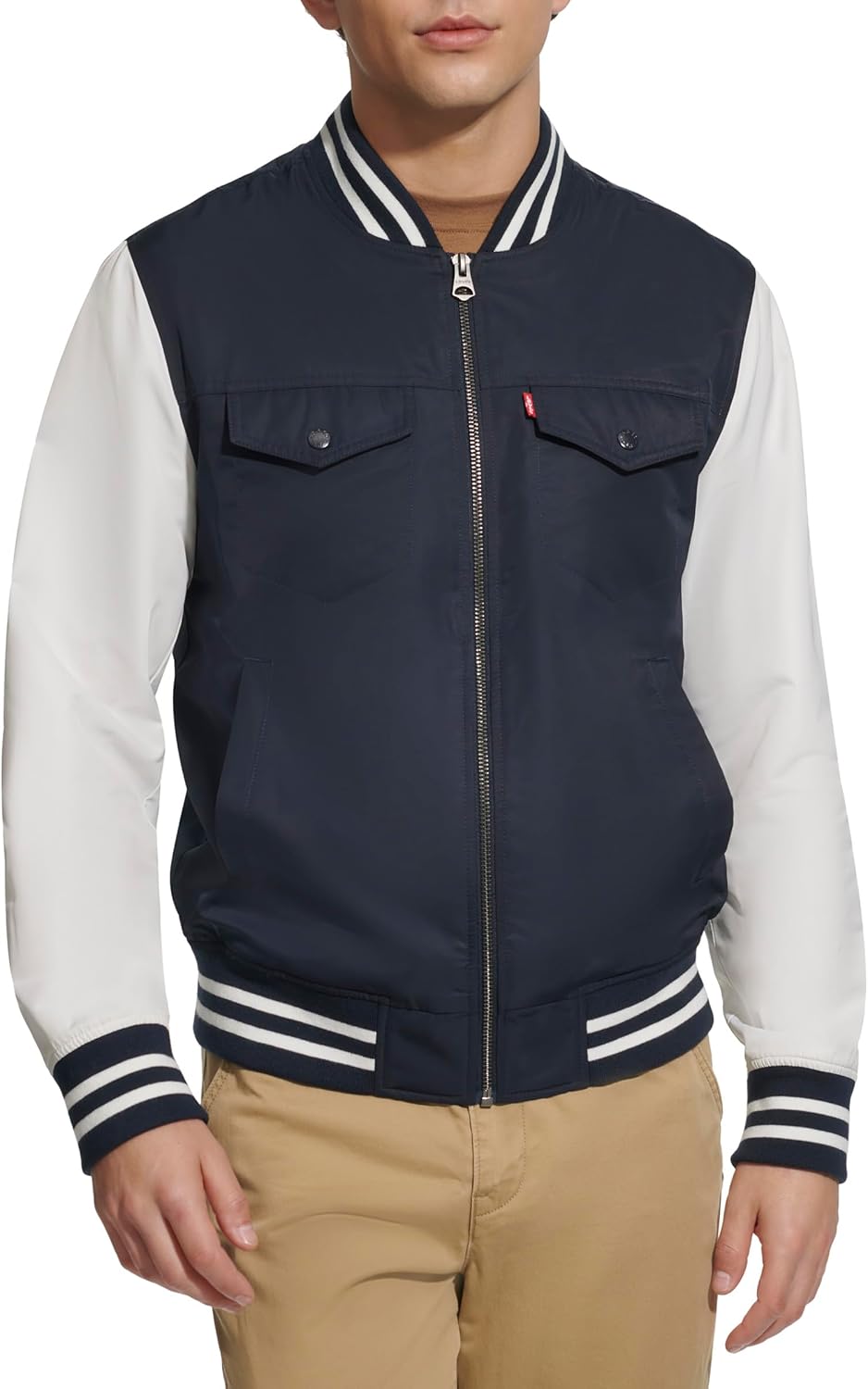 Куртка-бомбер в университетском стиле с капюшоном. Множество отделений для хранения вещей. Два верхних нагрудных кармана с застежкой на кнопку, два нижних прорезных кармана на молнии и один внутренний карман для безопасности. Застежка на молнию по центру спереди. Контрастная трикотажная резинка на манжетах и подоле для комфорта. Водонепроницаемая внешняя ткань. Фирменная нашивка Levi's на верхнем левом нагрудном кармане, нашивка Levi's с надписью «73» на правом рукаве и круглая нашивка с логотипом Levi's на левом рукаве.