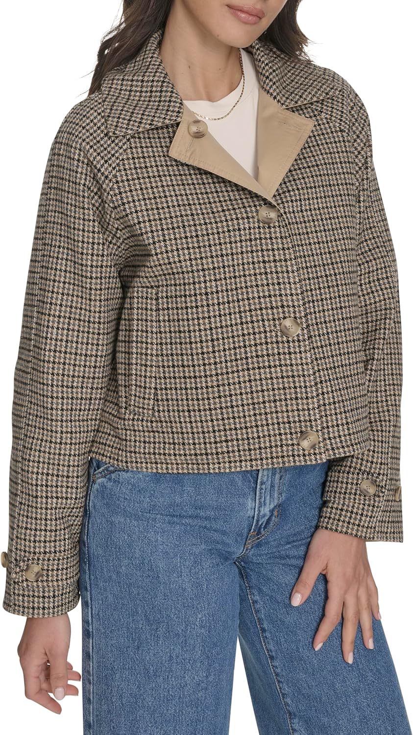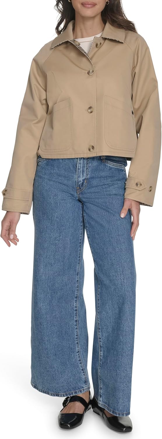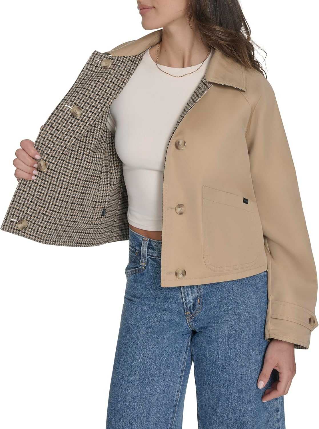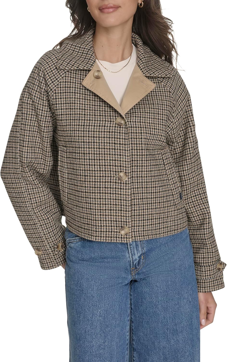 Женская двусторонняя короткая куртка-тренч Levi's предлагает два разных образа в одном стильном и непринужденном изделии. Одна сторона выполнена в классическом стиле тренча, а изнаночная сторона - в теплую клетку из шерстяной смесовой ткани для уюта и создания праздничного настроения.