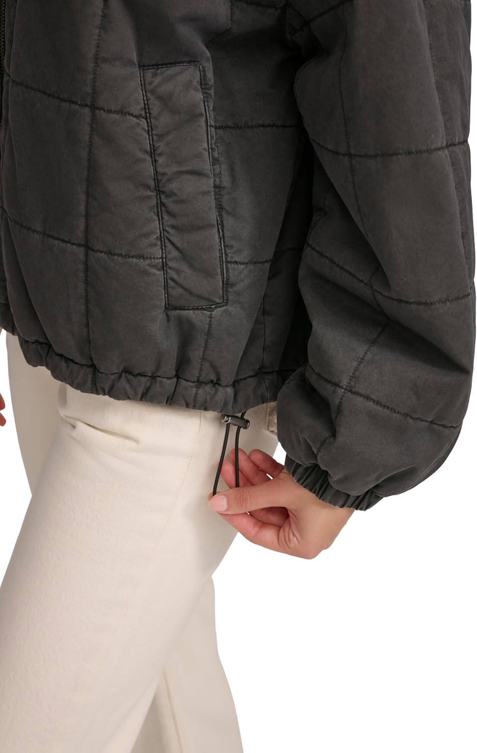 Регулируемый шнурок на подоле позволяет индивидуально подогнать посадку по фигуре.