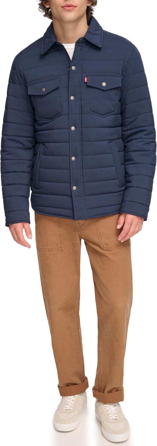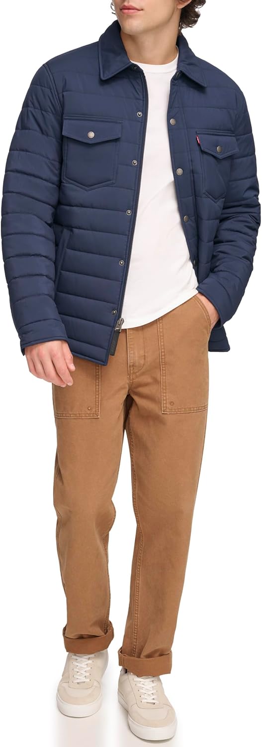 СТИЛЬНЫЕ ОСОБЕННОСТИ: Отложной воротник-стойка, красный ярлычок с логотипом Levi's на левой стороне груди, фирменная символика Levi's на кнопках. ФУНКЦИОНАЛЬНОСТЬ: Застежка-молния по центру спереди с накладкой на кнопках, два верхних нагрудных кармана на кнопках, два нижних прорезных кармана для рук, один внутренний карман для безопасности, регулируемые кнопки на манжетах. УНИВЕРСАЛЬНОСТЬ: Отличный вариант для переходного периода, удобно носить как днем, так и ночью.