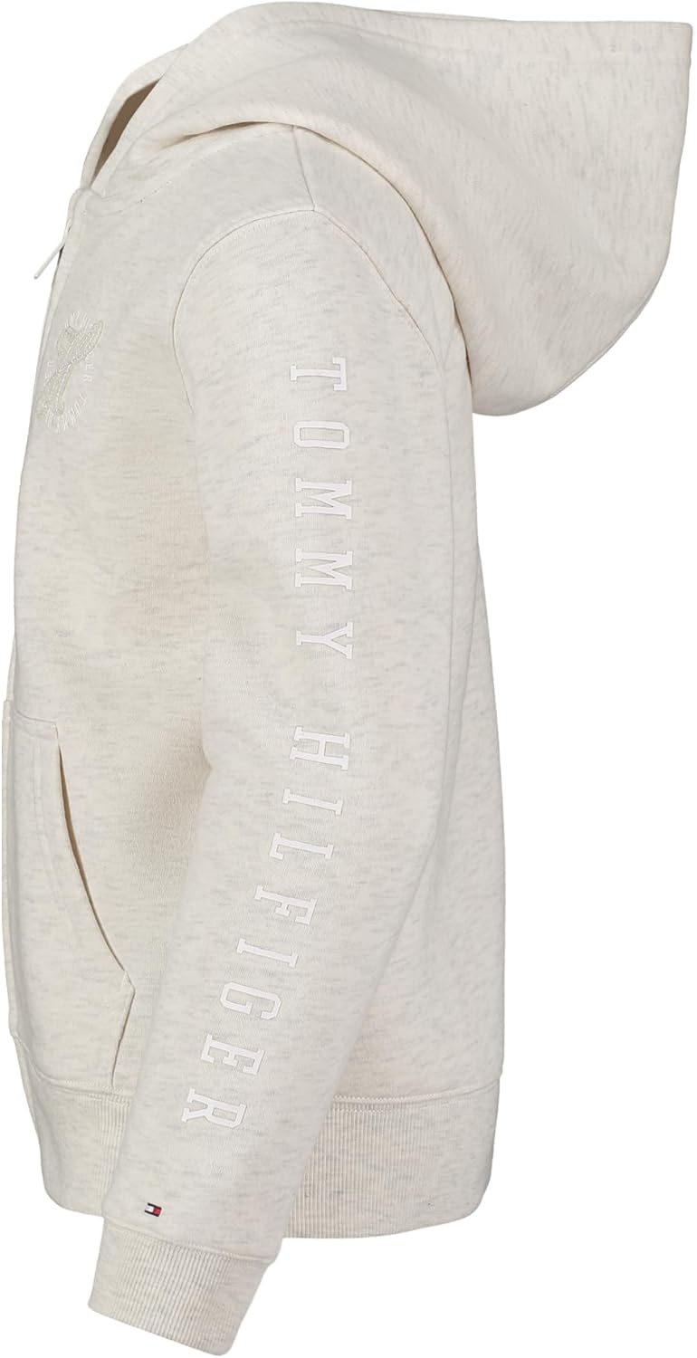 Прохладные дни не станут проблемой в этой фирменной флисовой толстовке с капюшоном от Tommy Hilfiger, украшенной войлочной и блестящей графикой спереди и на рукавах, что придает ей стильный спортивный вид.