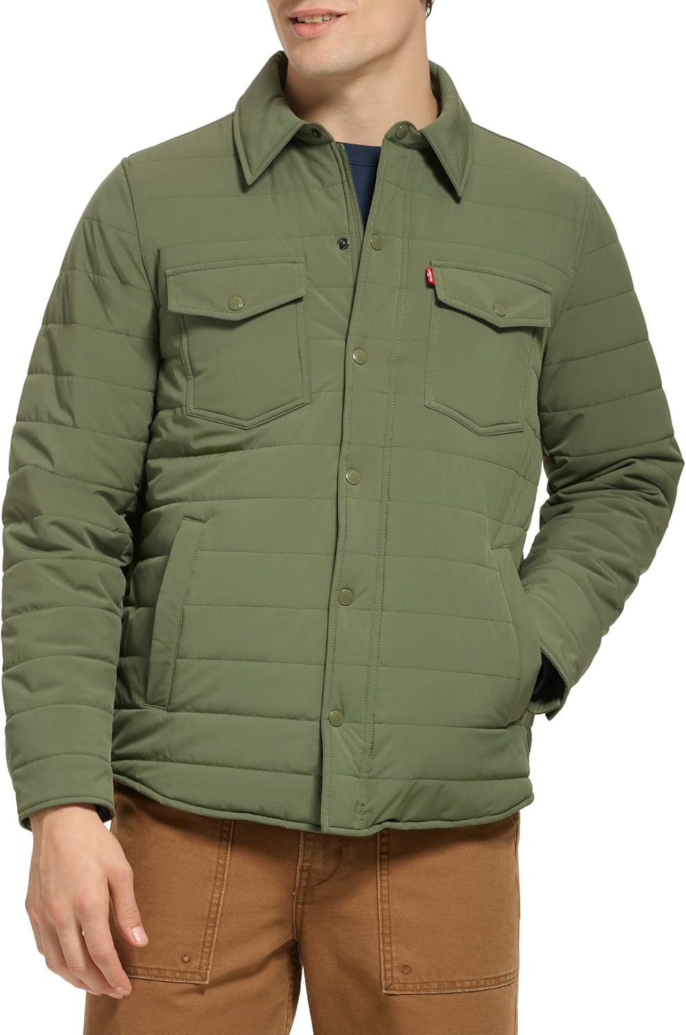 СТИЛЬНЫЕ ОСОБЕННОСТИ: Отложной воротник-стойка, красный ярлычок с логотипом Levi's на левой стороне груди, фирменная символика Levi's на кнопках. ФУНКЦИОНАЛЬНОСТЬ: Застежка-молния по центру спереди с накладкой на кнопках, два верхних нагрудных кармана на кнопках, два нижних прорезных кармана для рук, один внутренний карман для безопасности, регулируемые кнопки на манжетах. УНИВЕРСАЛЬНОСТЬ: Отличный вариант для переходного периода, удобно носить как днем, так и ночью.