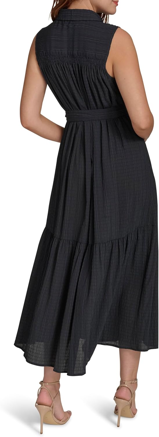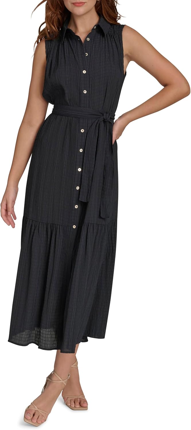 Это женское платье миди от Tommy Hilfiger - легкое платье-рубашка без рукавов с воротником.