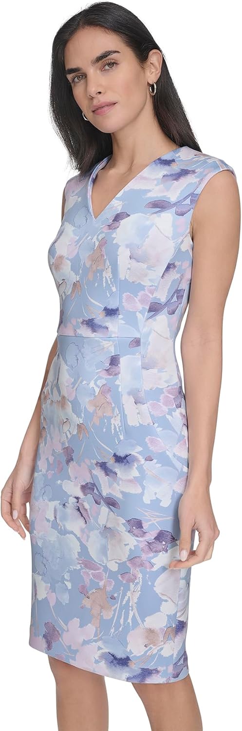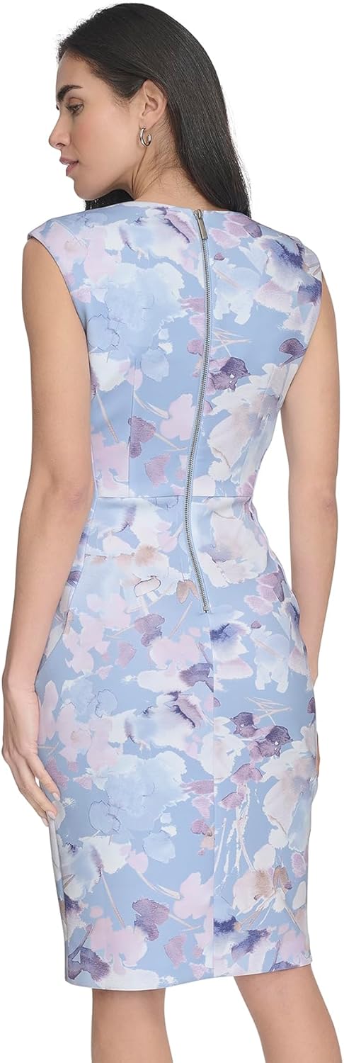 Это женское платье Calvin Klein - платье-футляр с цветочным принтом и короткими рукавами.