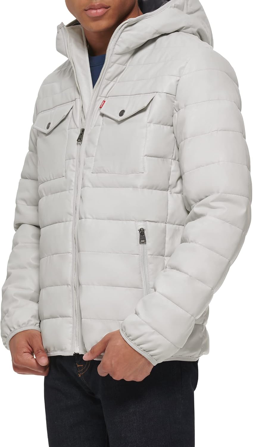 СТИЛЬНЫЕ ОСОБЕННОСТИ: Мягкая эластичная ткань, два верхних нагрудных кармана, два нижних кармана для рук, один внутренний карман для безопасности, красный логотип Levi's на левом кармане. ФУНКЦИОНАЛЬНОСТЬ: Эластичные манжеты и подол для комфорта, застежка-молния по центру спереди. УТЕПЛЯЮЩИЕ ОСОБЕННОСТИ: Стеганые вставки с наполнителем из искусственного пуха для сохранения тепла тела.