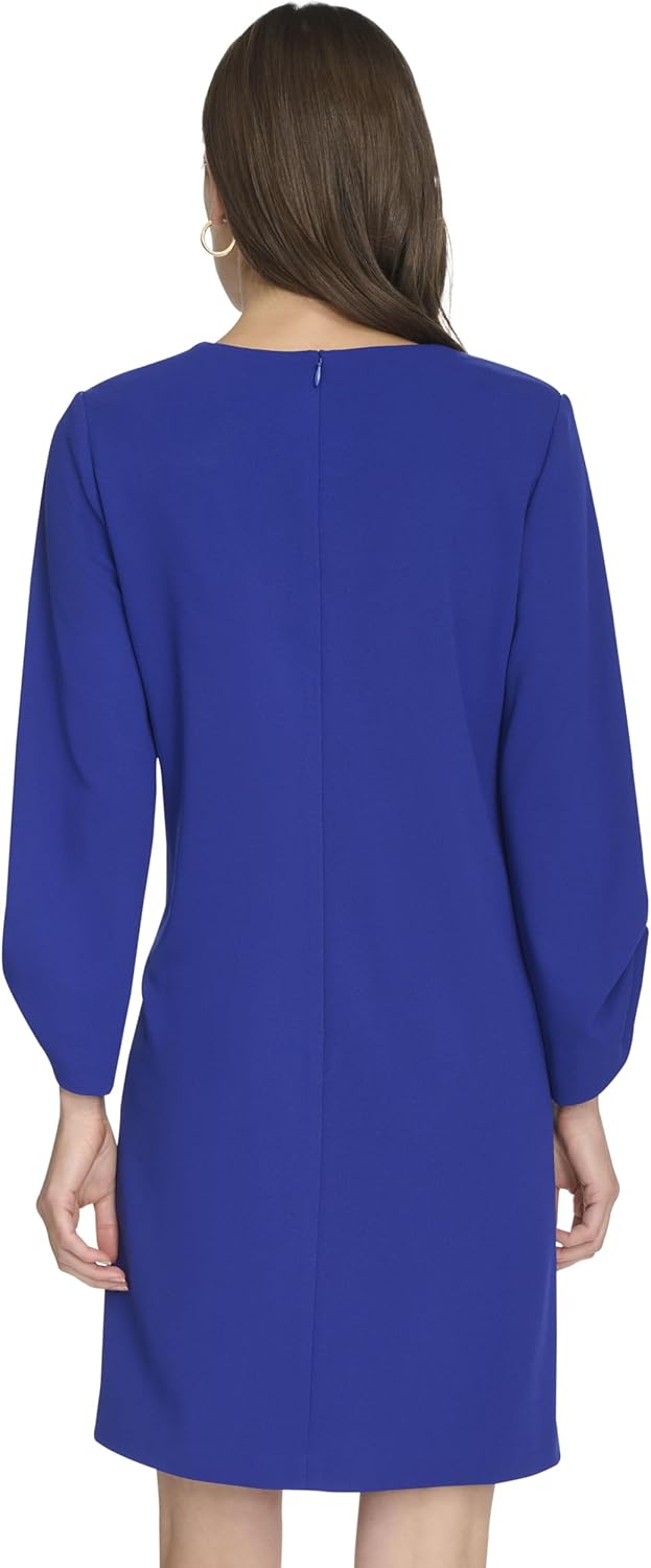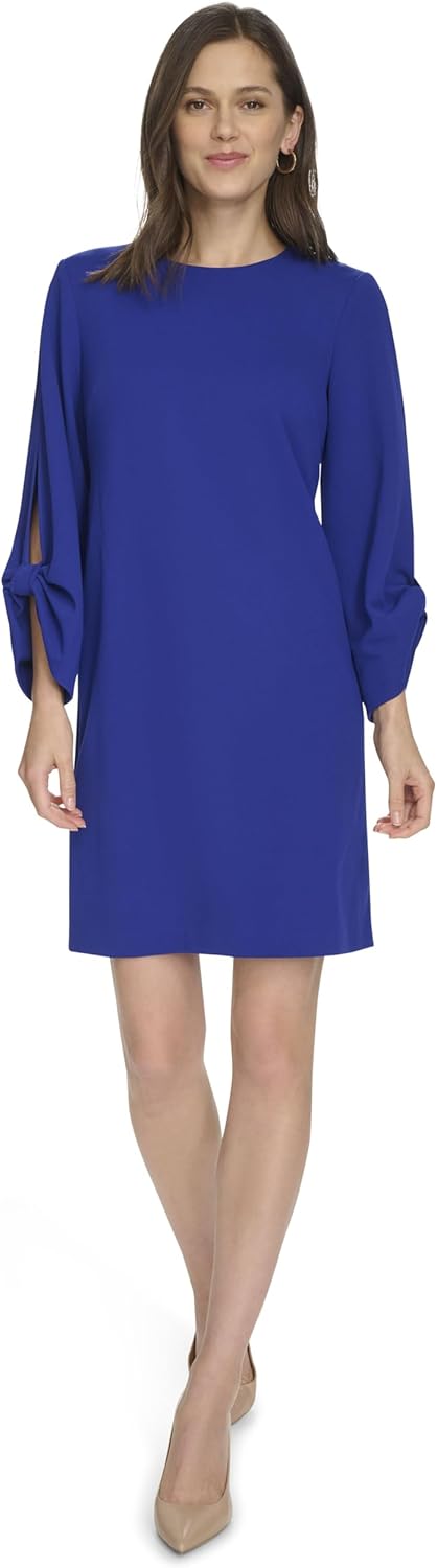 Это женское платье Calvin Klein - прямое, с рукавами 3/4 и выше колена, для деловых мероприятий.