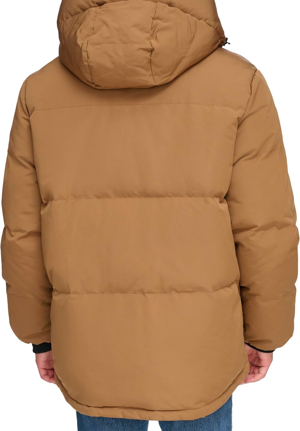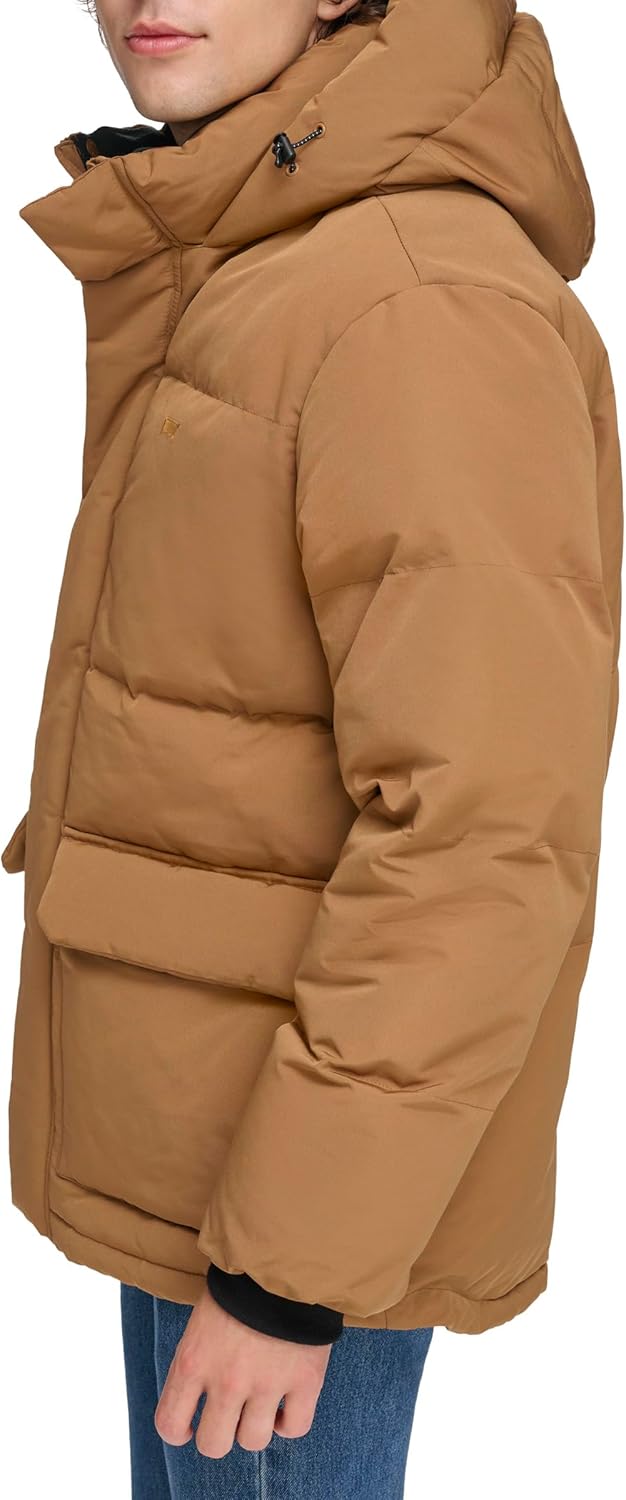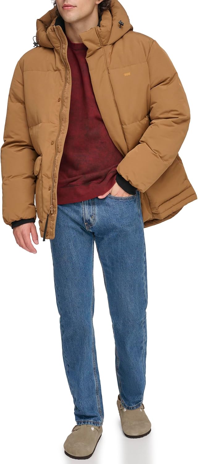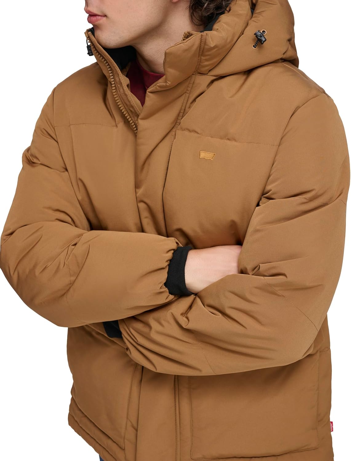 СТИЛЬНЫЕ ОСОБЕННОСТИ: Логотип Levi's на левой стороне груди. ФУНКЦИОНАЛЬНОСТЬ: Застежка-молния по центру спереди с планкой на кнопках, регулируемый шнурок на капюшоне и подоле, два нижних кармана с клапанами с боковым входом. УТЕПЛЯЮЩИЕ ОСОБЕННОСТИ: Внутренняя подкладка с наполнителем из полиэфирного пуха, пришитый капюшон и трикотажные манжеты в рубчик.