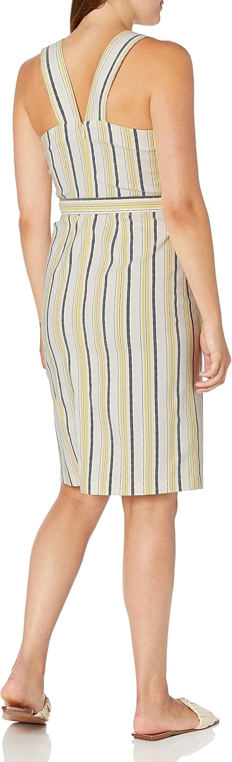Мини-платье без рукавов в полоску с пуговицами с логотипом TH на левой боковой планке и прикрепленным завязывающимся поясом.