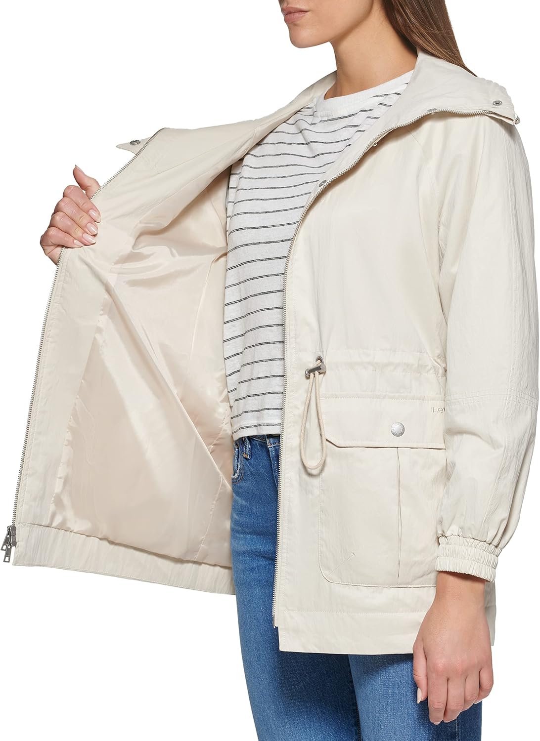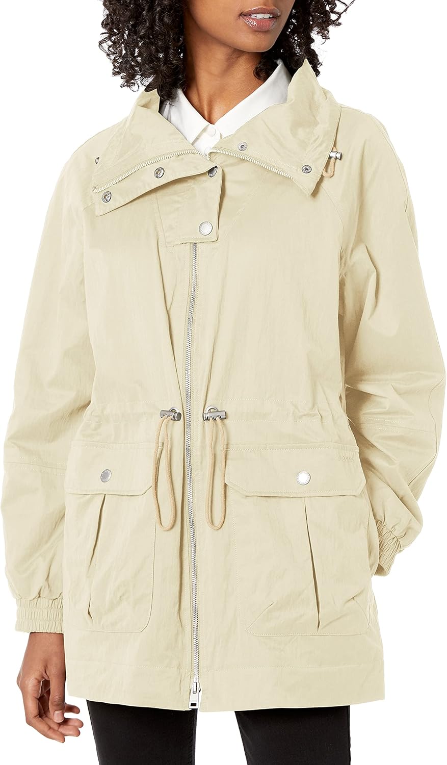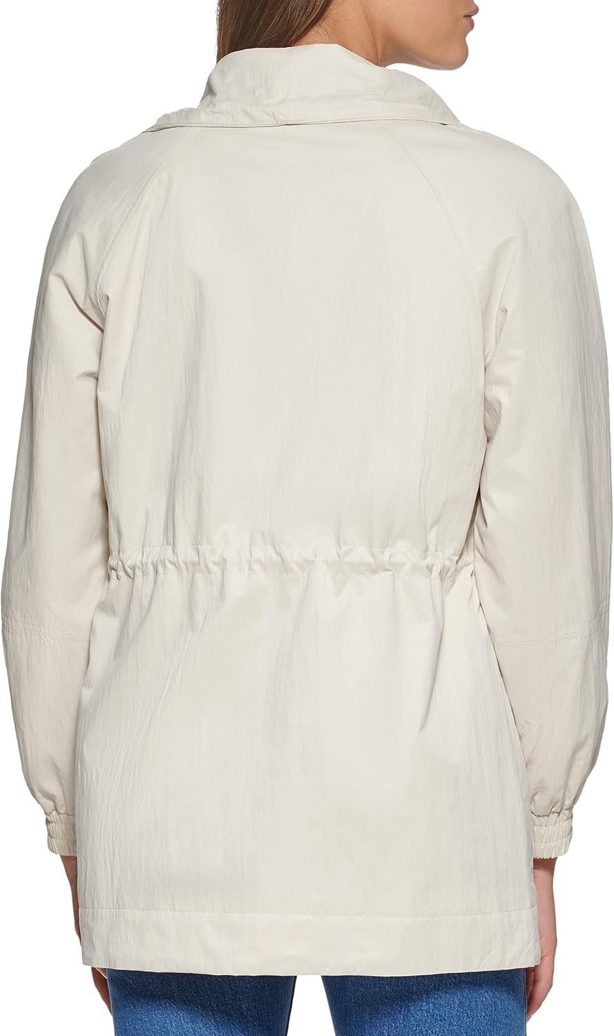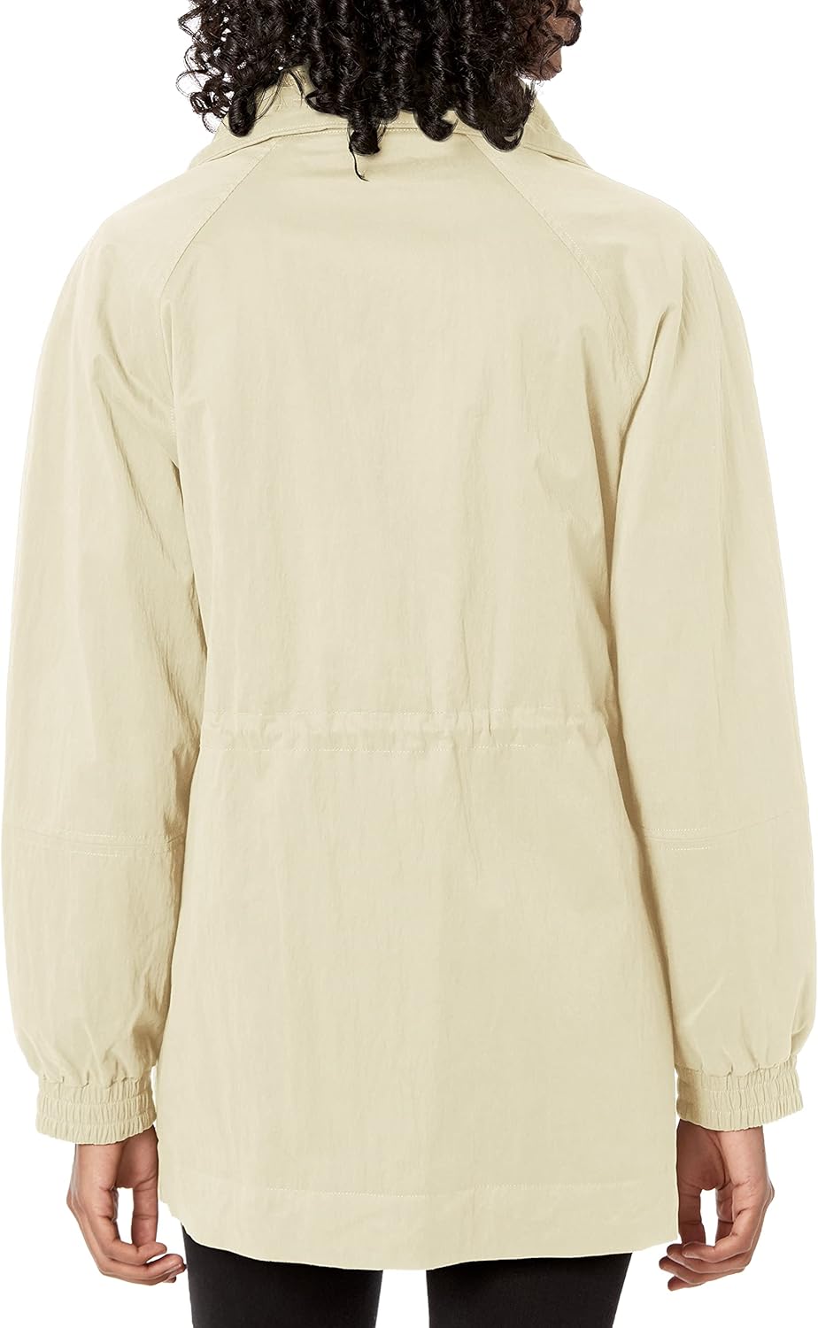 Функциональная куртка с утягивающей талией, регулируемой талией и воротником с помощью эластичного шнура, двумя нижними карманами на кнопках с боковым входом, эластичными манжетами и застежкой-молнией по центру спереди