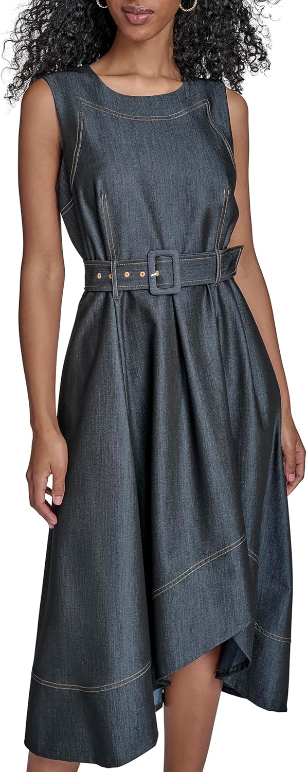 Это женское платье Calvin Klein - джинсовое, без рукавов, с поясом для вечеринки.
