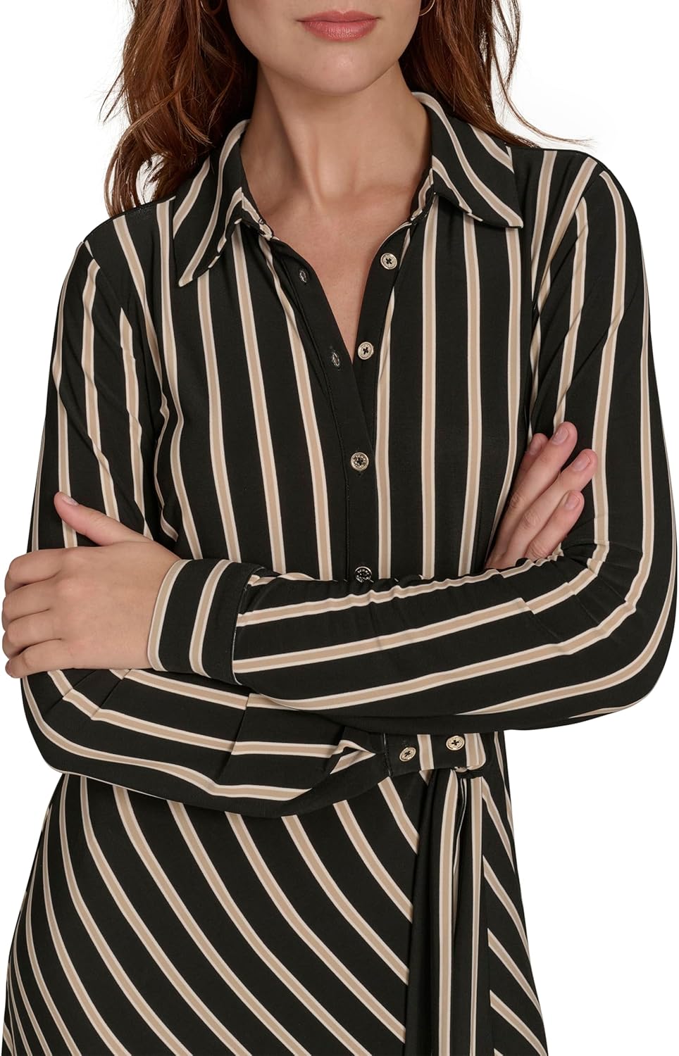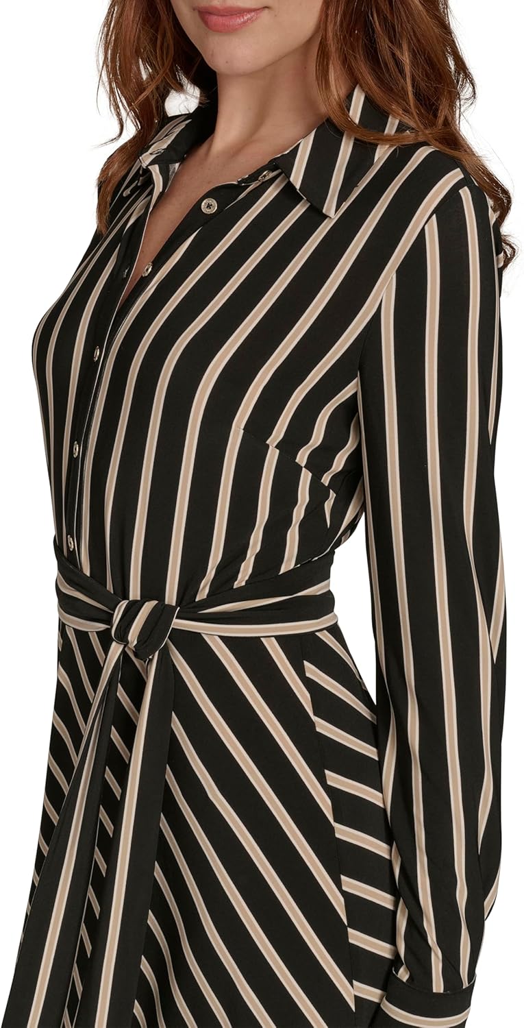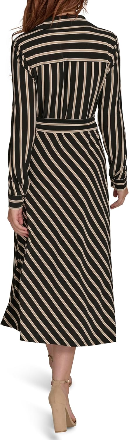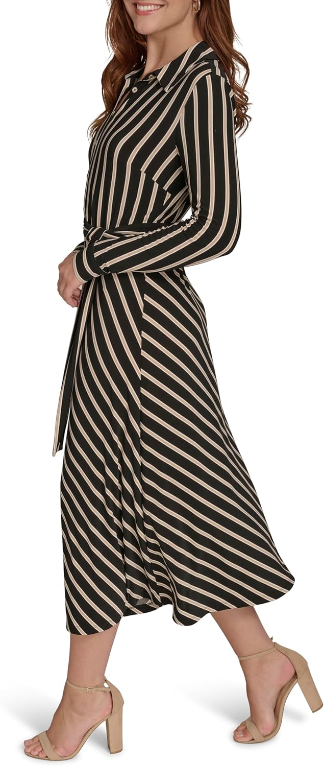 Особенности: длинные рукава, воротник, джерси в полоску, завязка, длина миди