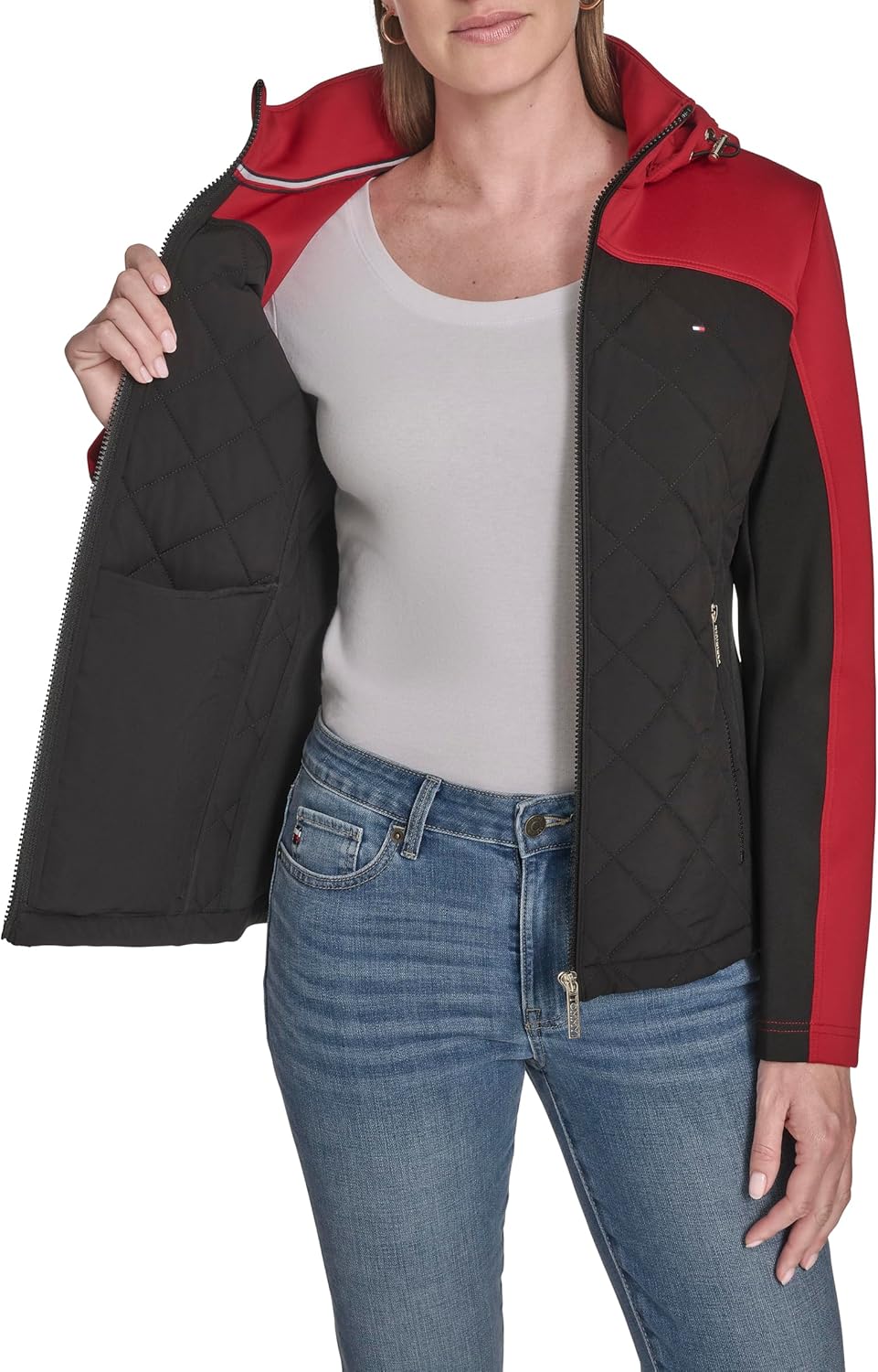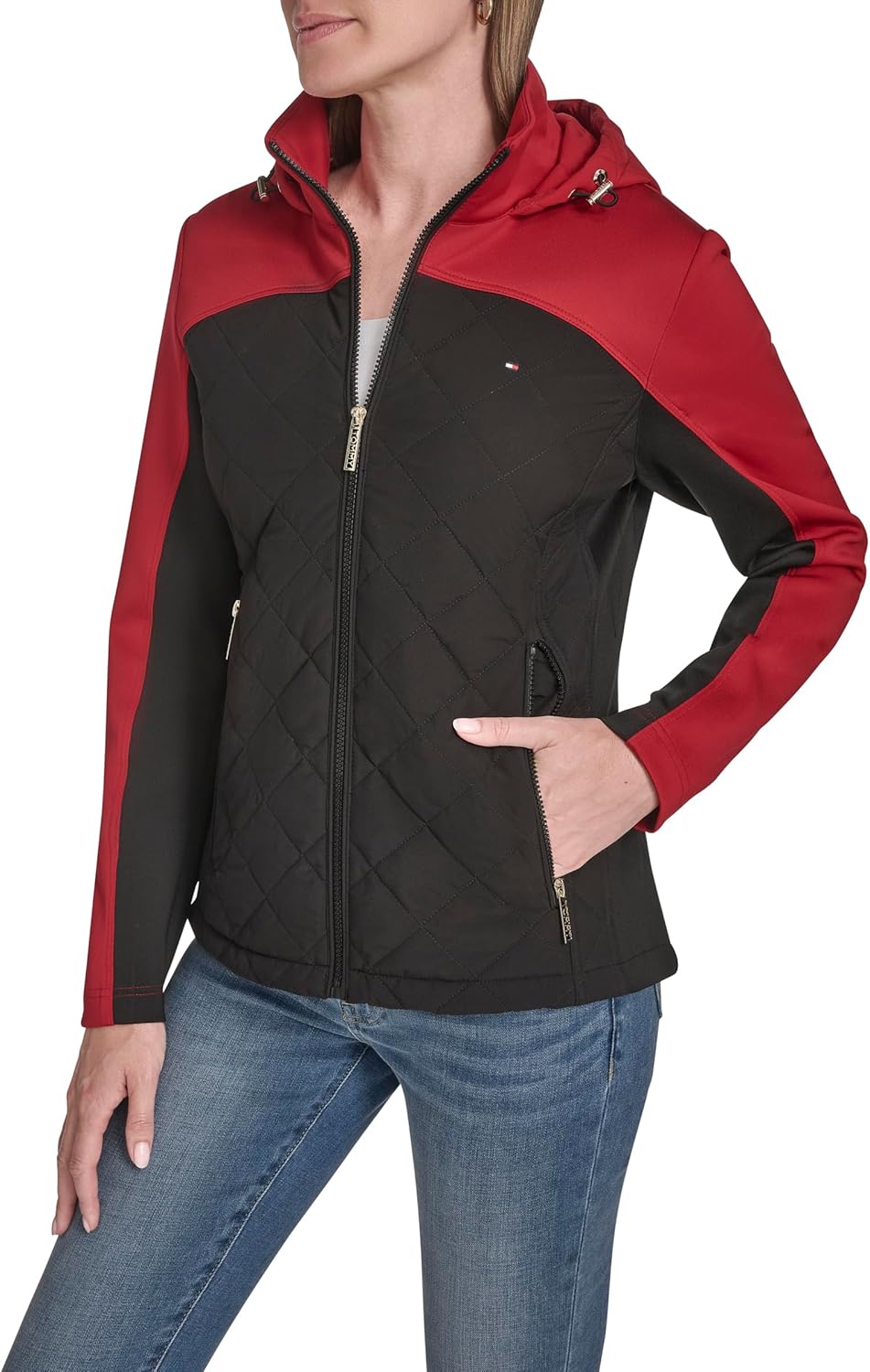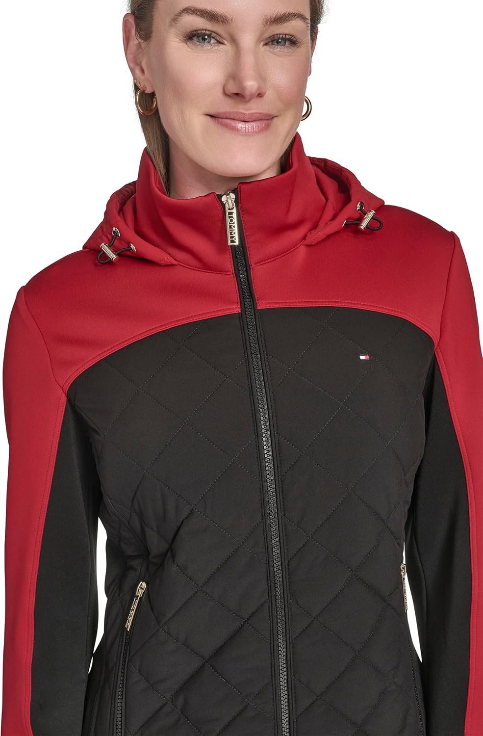 Эта женская спортивная стеганая куртка Tommy Hilfiger Scuba Outerwear представляет собой стеганую куртку с капюшоном в стиле «цветной блок».
