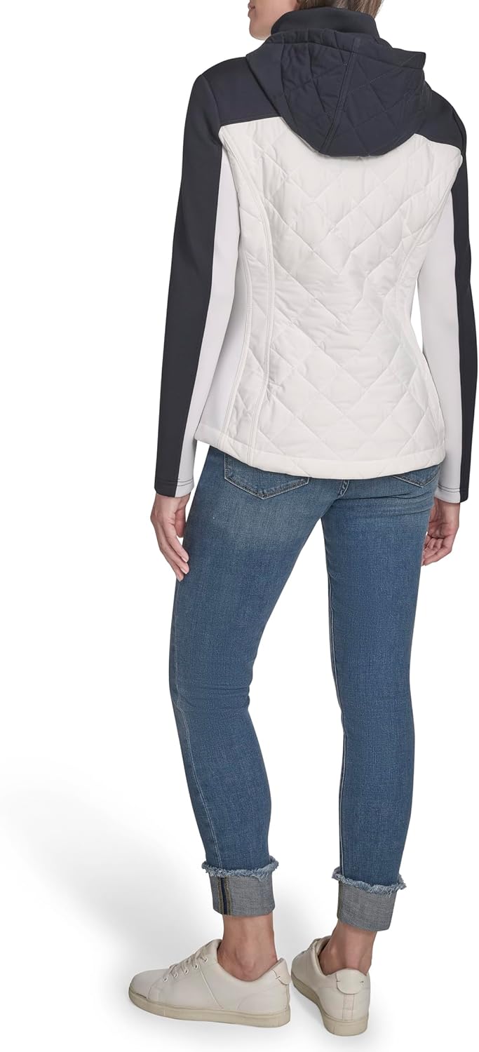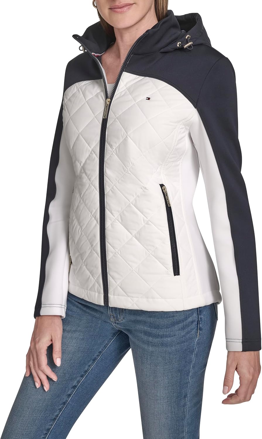 Эта женская спортивная стеганая куртка Tommy Hilfiger Scuba Outerwear представляет собой стеганую куртку с капюшоном в стиле «цветной блок».