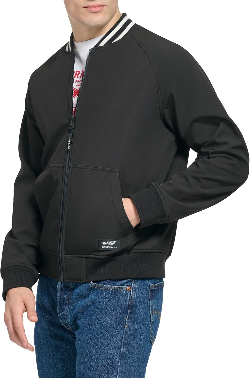 СТИЛЬНЫЕ ОСОБЕННОСТИ: Воротник из трикотажной резинки в полоску, фирменная символика Levi's на бегунке молнии спереди, фирменная нашивка Levi's на левом нижнем кармане. ФУНКЦИОНАЛЬНОСТЬ: Застежка-молния по центру спереди, два нижних прорезных кармана, мягкие манжеты, подол и воротник из трикотажной резинки для комфорта. МАТЕРИАЛЫ: Гладкая на ощупь ткань Softshell водо- и ветроустойчива, что делает эту куртку идеальной для повседневной носки.
