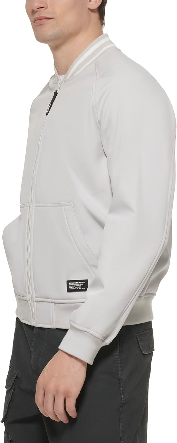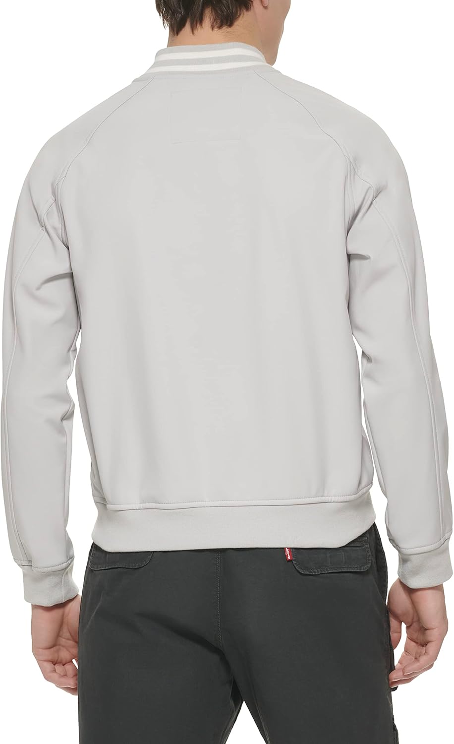 СТИЛЬНЫЕ ОСОБЕННОСТИ: Воротник из трикотажной резинки в полоску, фирменная символика Levi's на бегунке молнии спереди, фирменная нашивка Levi's на левом нижнем кармане. ФУНКЦИОНАЛЬНОСТЬ: Застежка-молния по центру спереди, два нижних прорезных кармана, мягкие манжеты, подол и воротник из трикотажной резинки для комфорта. МАТЕРИАЛЫ: Гладкая на ощупь ткань Softshell водо- и ветроустойчива, что делает эту куртку идеальной для повседневной носки.