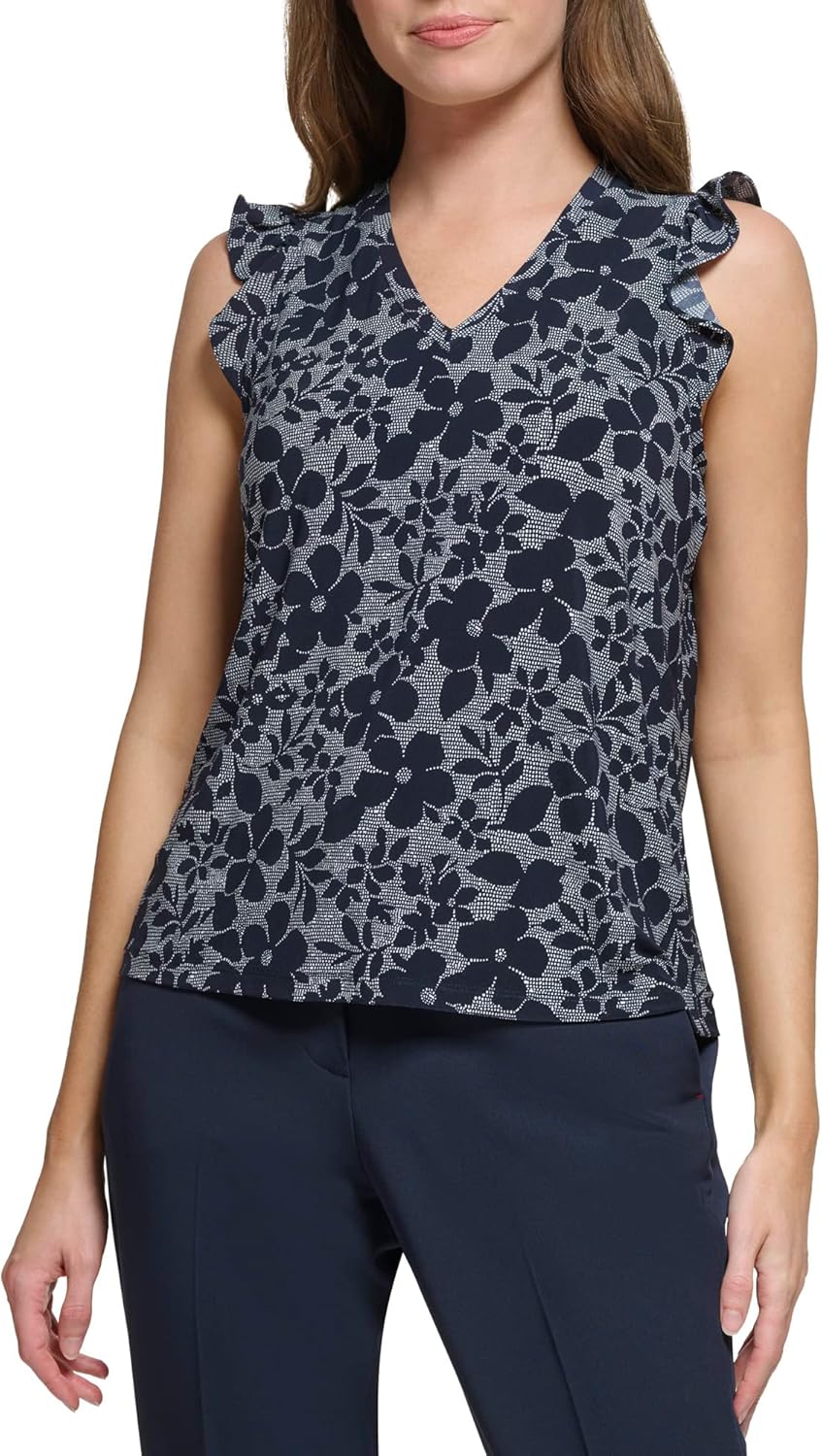 Эта женская рубашка Tommy Hilfiger представляет собой костюмный топ без рукавов с воротником-хомут из трикотажного джерси.