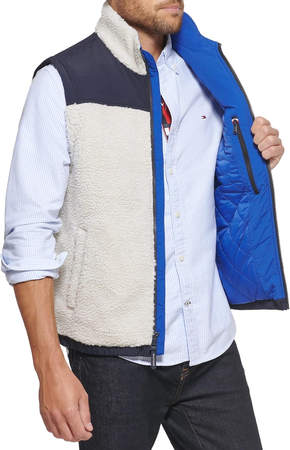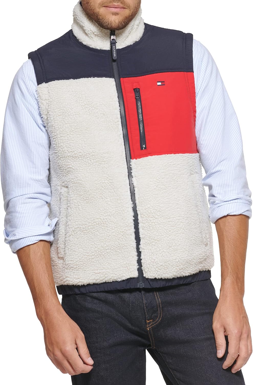 Почувствуйте себя настоящей американкой с этим контрастным жилетом из шерпы с воротником-стойкой от Tommy Hilfiger. Этот жилет из шерпы с контрастной кокеткой на плечах и нагрудным карманом достаточно теплый, чтобы носить его отдельно или в сочетании с другими вещами для дополнительного тепла.