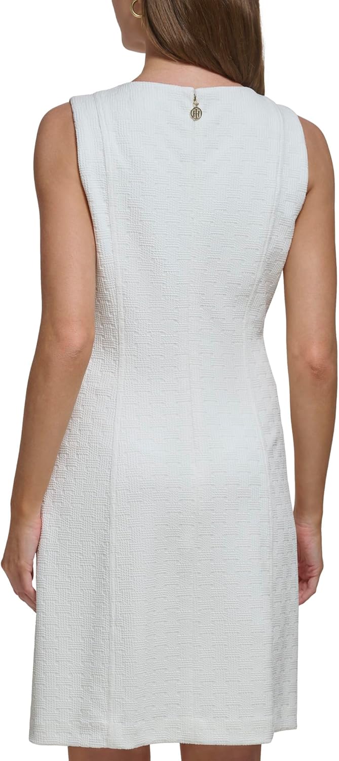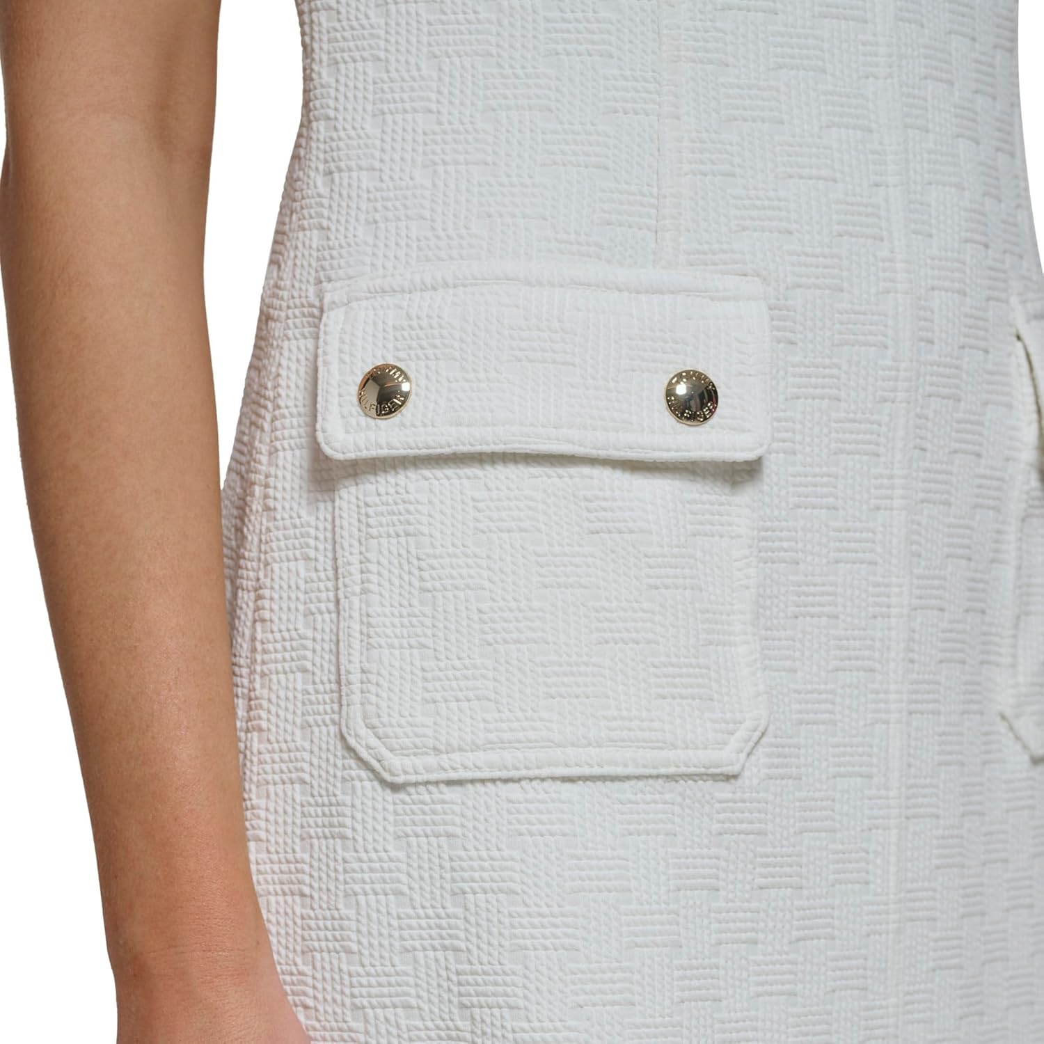 Это женское платье-трапеция от Tommy Hilfiger представляет собой платье-трапецию из плетеной ткани, текстурированного трикотажа, без рукавов, с логотипом и карманами на кнопках.