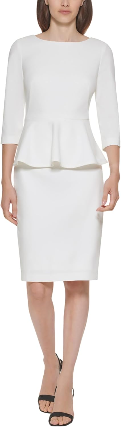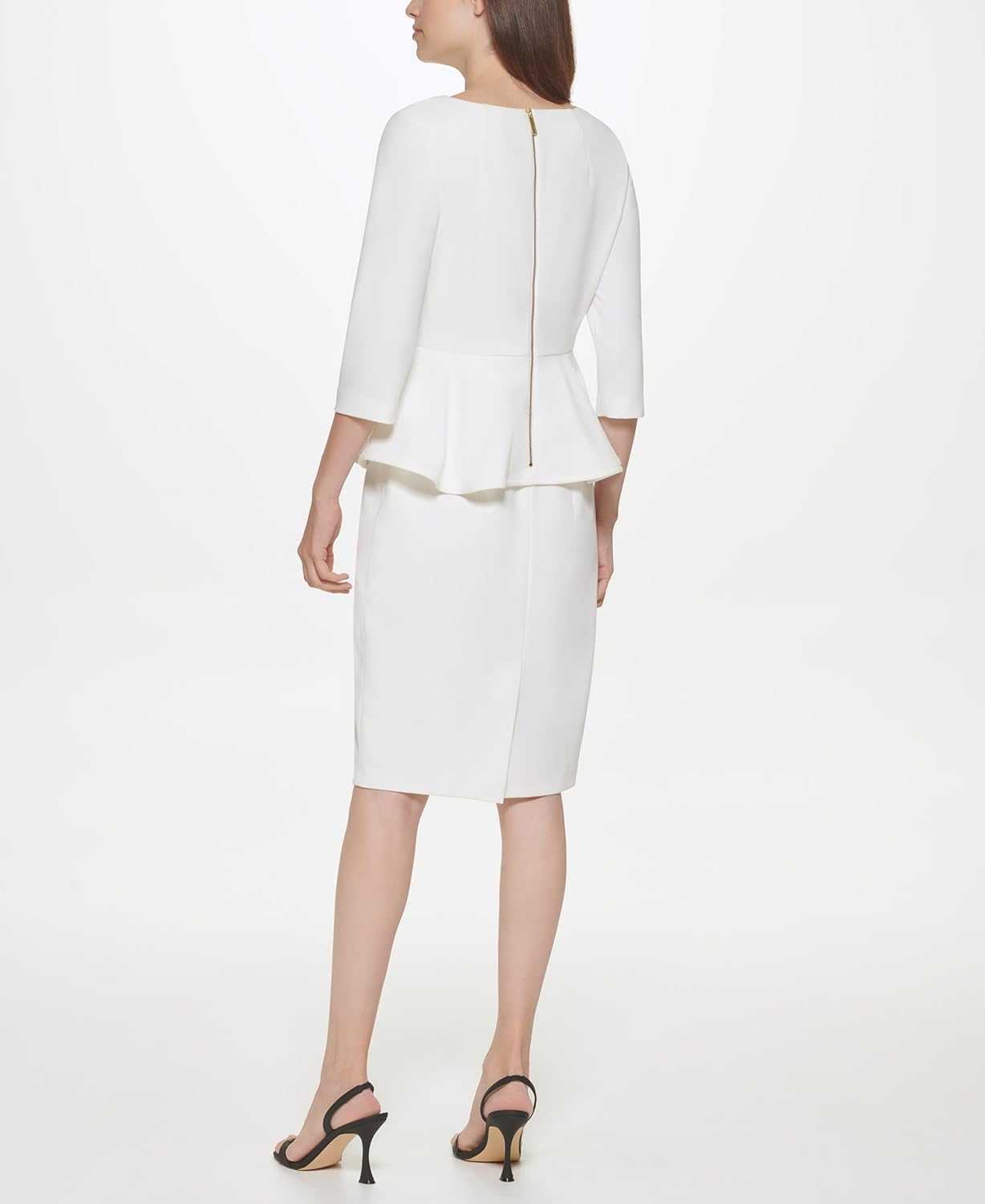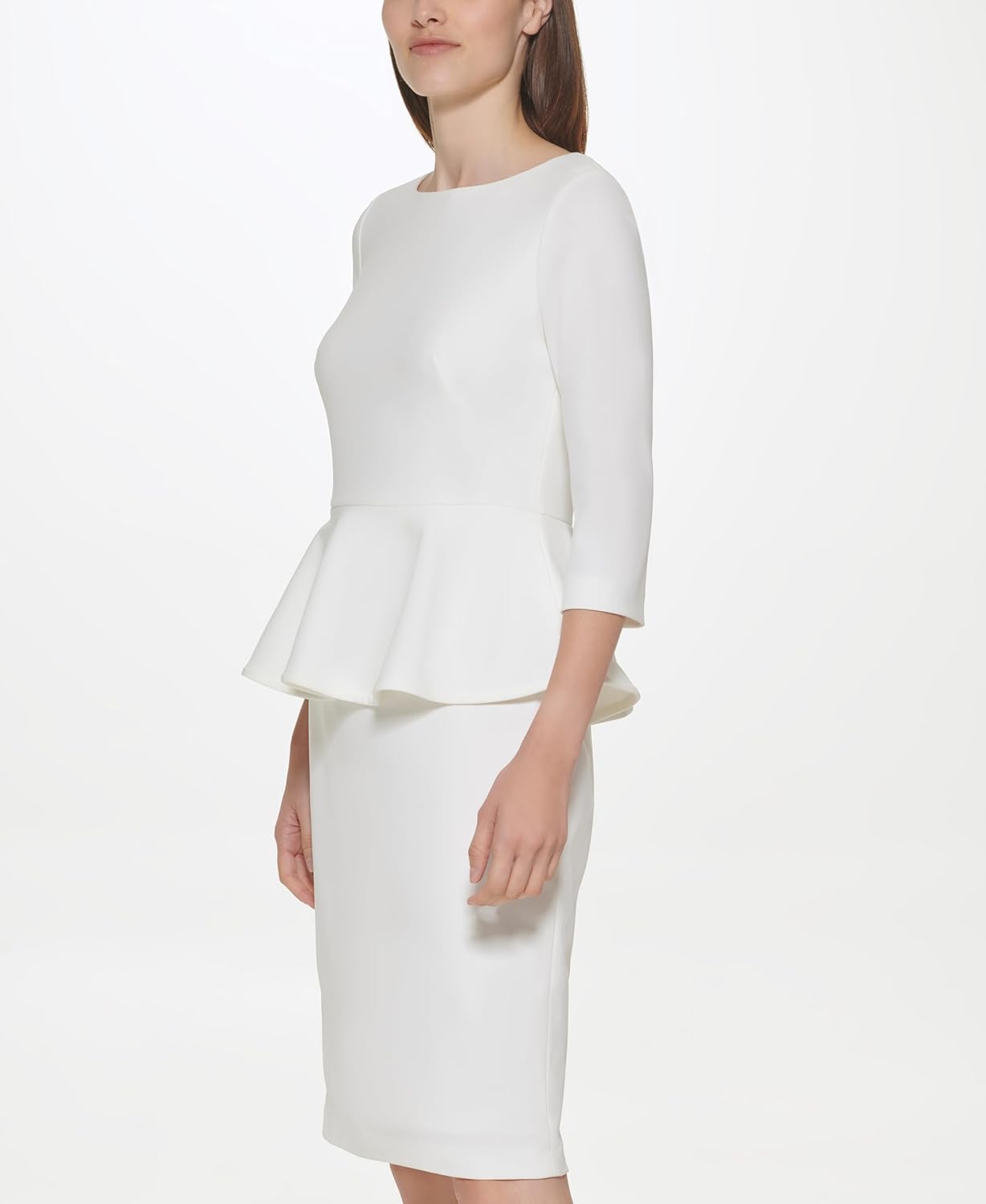 Это женское платье-футляр Calvin Klein из крепа Scuba Crepe с рукавами 3/4 и баской.