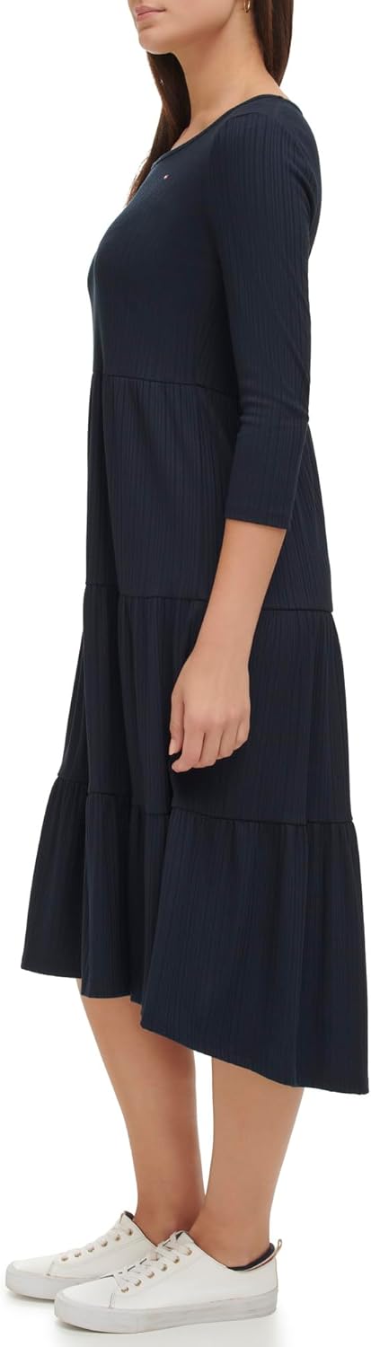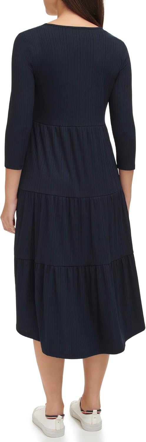 Это женское спортивное платье Tommy Hilfiger - многоярусное платье длины миди с круглым вырезом и рукавами длиной 3/4.