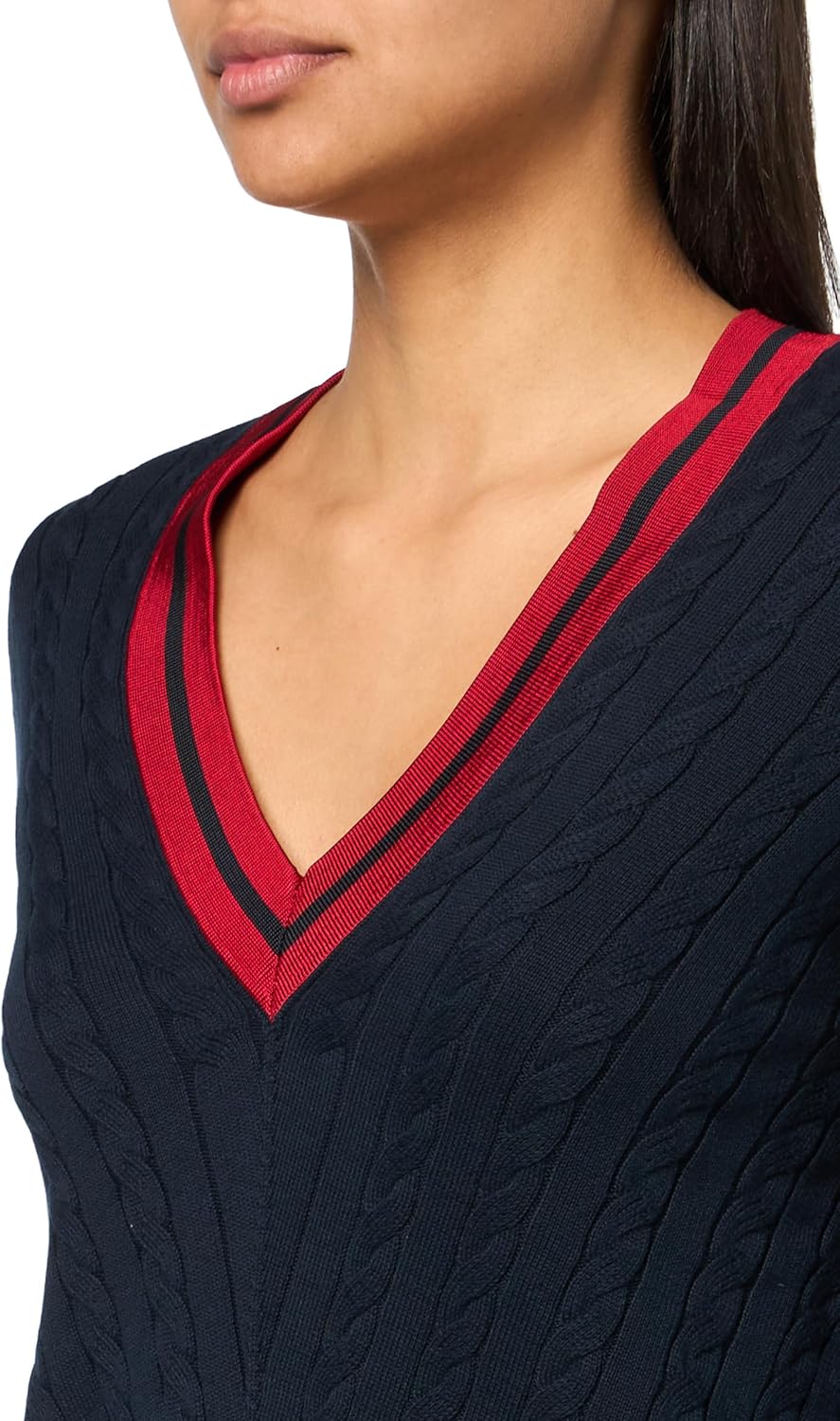 Этот женский спортивный свитер Tommy Hilfiger представляет собой пуловер с длинными рукавами и V-образным вырезом.