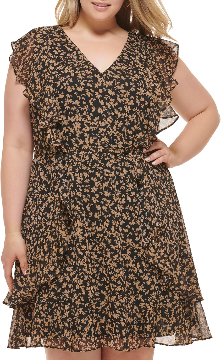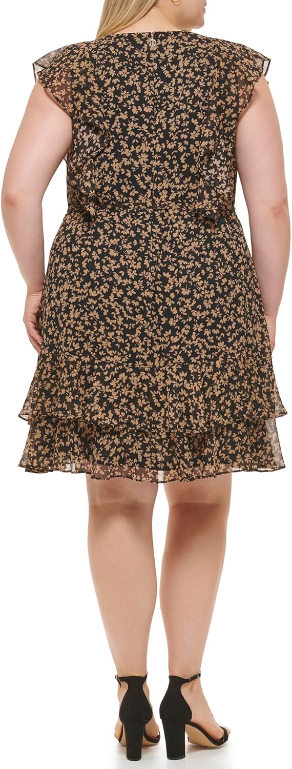 Это женское платье Tommy Hilfiger, облегающее и расклешенное, из шифона, средней длины, с V-образным вырезом и рукавами-крылышками в горошек.