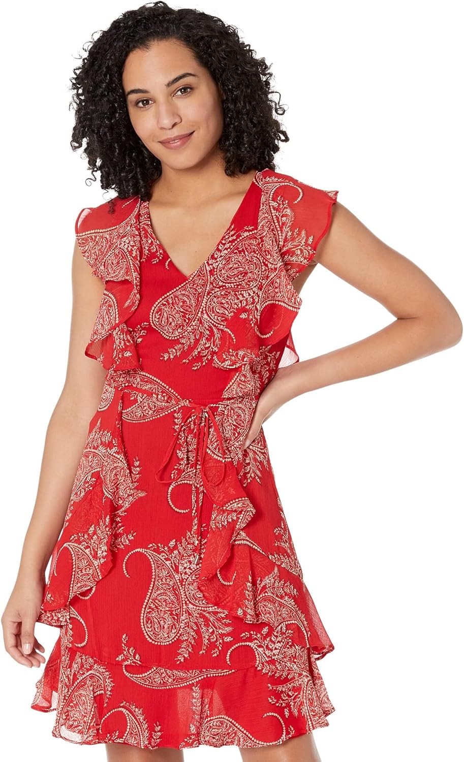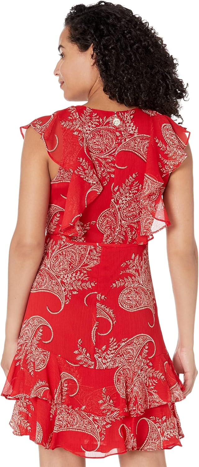 Это женское платье Tommy Hilfiger, облегающее и расклешенное, из шифона, средней длины, с V-образным вырезом и рукавами-крылышками в горошек.