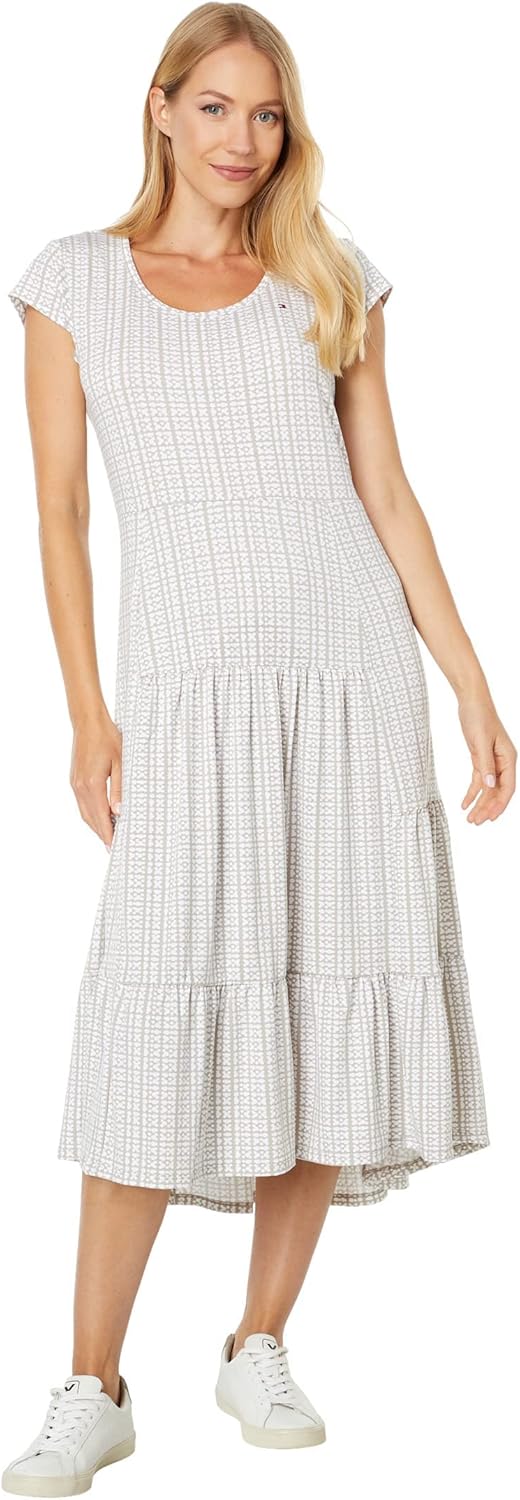 Это женское спортивное платье Tommy Hilfiger - многоярусное платье длины миди с круглым вырезом и рукавами длиной 3/4.