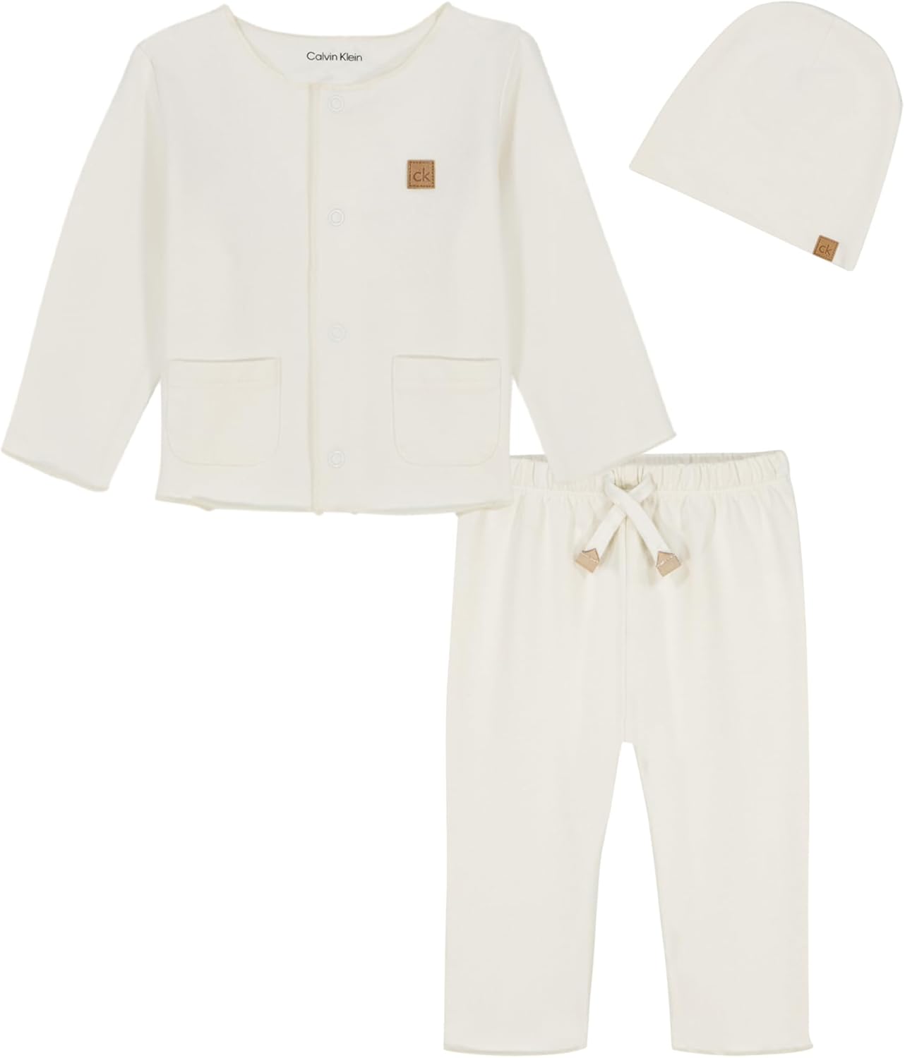 Предварительно выстиранный для мягкости ультразамшевый детский французский трикотаж станет идеальным дополнением к первой поездке домой. Три пары вещей из органического хлопка от Calvin Klein включают шапочку, штанишки и кардиган с застежкой спереди.