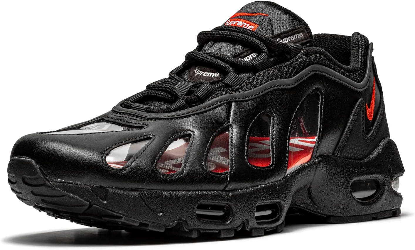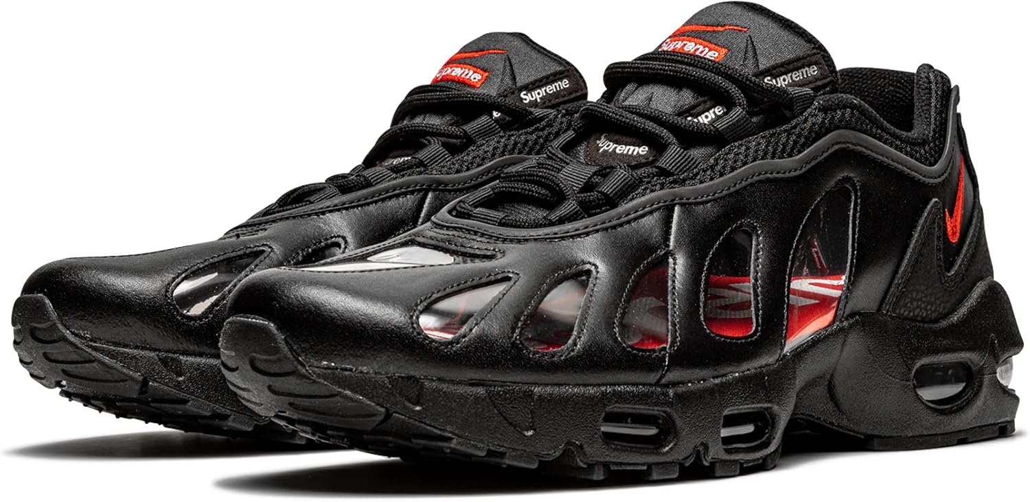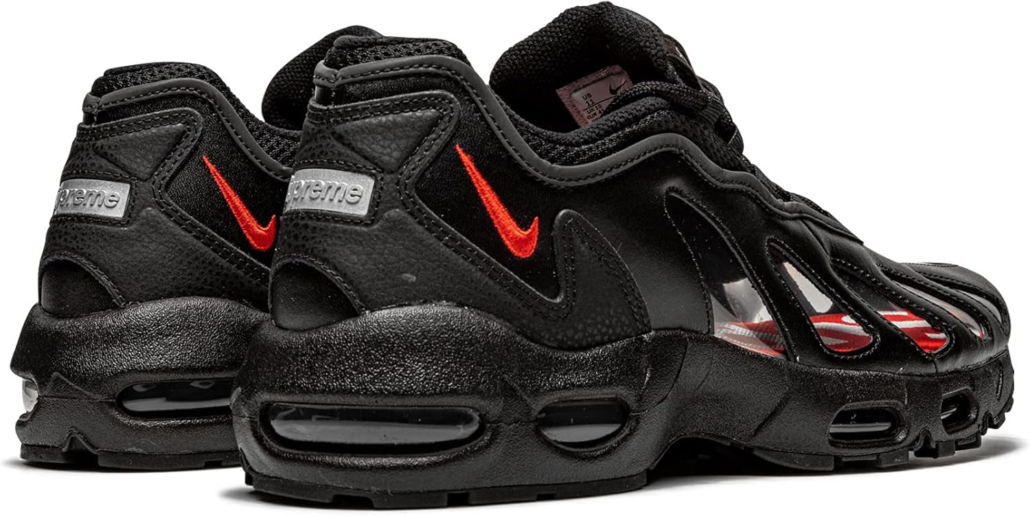 Supreme x Nike Air Max 96 «Black» - это совместная работа всемирно известного уличного бренда и Nike над ретро-кроссовками, дебютировавшими в 1996 году. Air Max 96, не слишком заметные по сравнению с такими известными современниками, как Nike Air Max 1 и Air Max 90, были выпущены через год после Air Max 95 и в последние годы практически отсутствовали в ретро-релизах. До сих пор Supreme представили эту модель для своей коллекции Весна/Лето 2021 и модифицировали дизайн, добавив полупрозрачные вставки по бокам. Новый дизайн заменяет сетчатые панели, которые были на оригинальных Air Max 96. Остальная часть верха, за исключением воротника и люверсов, выполнена из черной кожи. На боковой части пятки находится красный вышитый Swoosh. Брендинг Supreme находится под красным вышитым Swoosh на верхней части язычка и по краям язычка. Серебряная пластина с брендингом Supreme находится на пятке. Дизайн видимых вставок Air в черной промежуточной подошве аналогичен дизайну Air Max 95 с видимыми вставками Air в области пятки и передней части стопы.