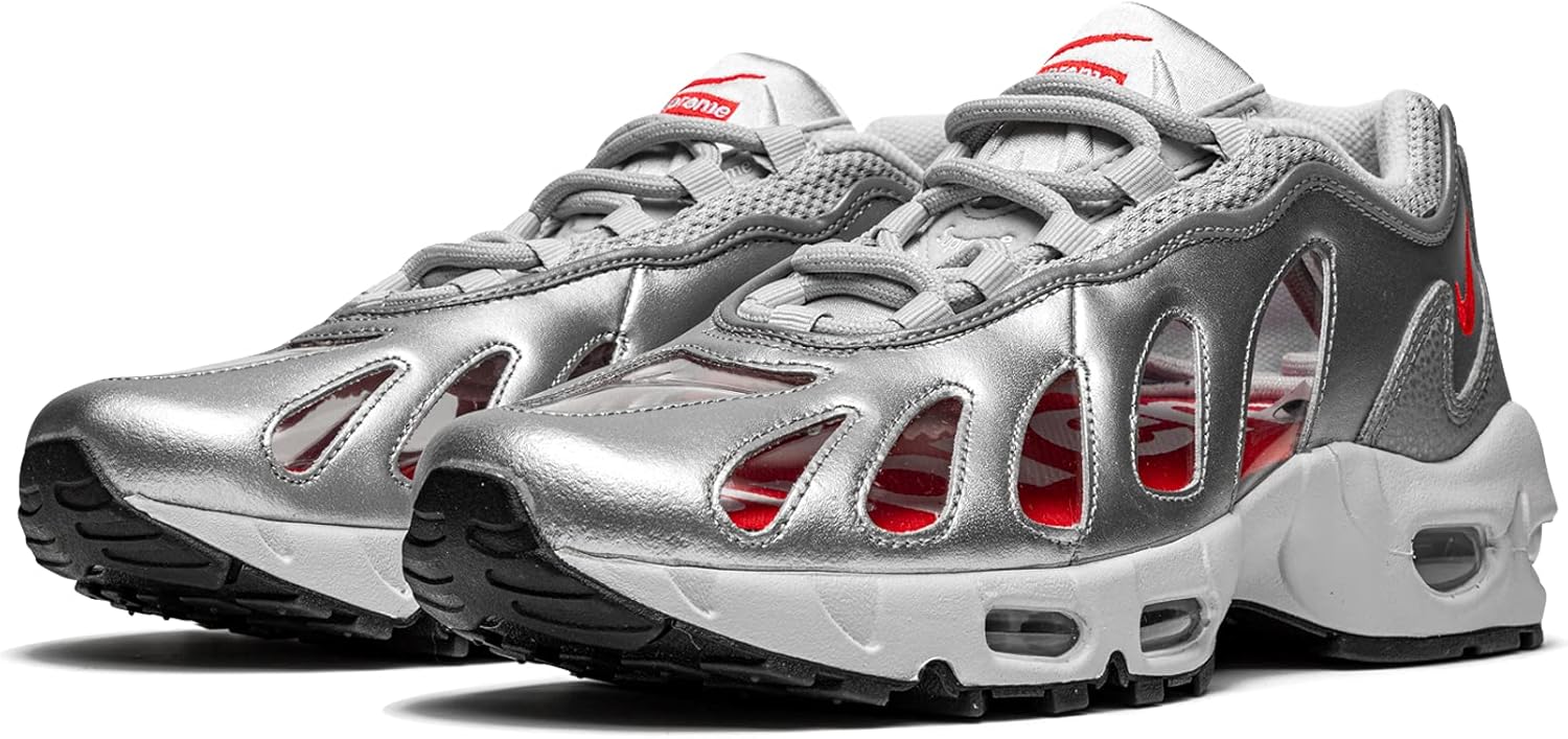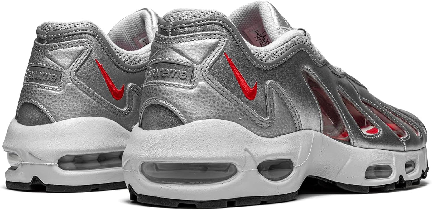 Supreme x Nike Air Max 96 «Silver» - это коллаборация весны 2021 года между «известным во всем мире» уличным брендом и Nike, созданная для ретро-кроссовок 1996 года. Относительно малоизвестный оригинальный релиз Air Max 96 был зажат между двумя моделями Nike Air Max: Air Max 95 и Air Max 97, что могло бы объяснить его непопулярный статус в мире кроссовок. В последние годы он практически отсутствовал в ретро-релизах, за исключением Supreme, представивших эту модель для своей коллекции весна/лето 2021 года. В типичной для Supreme манере бренд смело изменил дизайн, добавив полупрозрачные панели по бокам. Новый облик заменяет сетчатые панели, которые были на оригинальных Air Max 96. За исключением воротника и люверсов, остальная часть верха выполнена из металлизированной серебристой кожи. На боковой части пятки расположен красный вышитый Swoosh. Под красным вышитым логотипом Swoosh на верхней части язычка и по краям находится логотип Supreme. На пятке расположена серебристая пластинка с логотипом Supreme. Дополняют дизайн видимые вставки Air в области пятки и передней части подошвы, аналогичные Air Max 95. Дата выхода: 6 мая 2021 г.