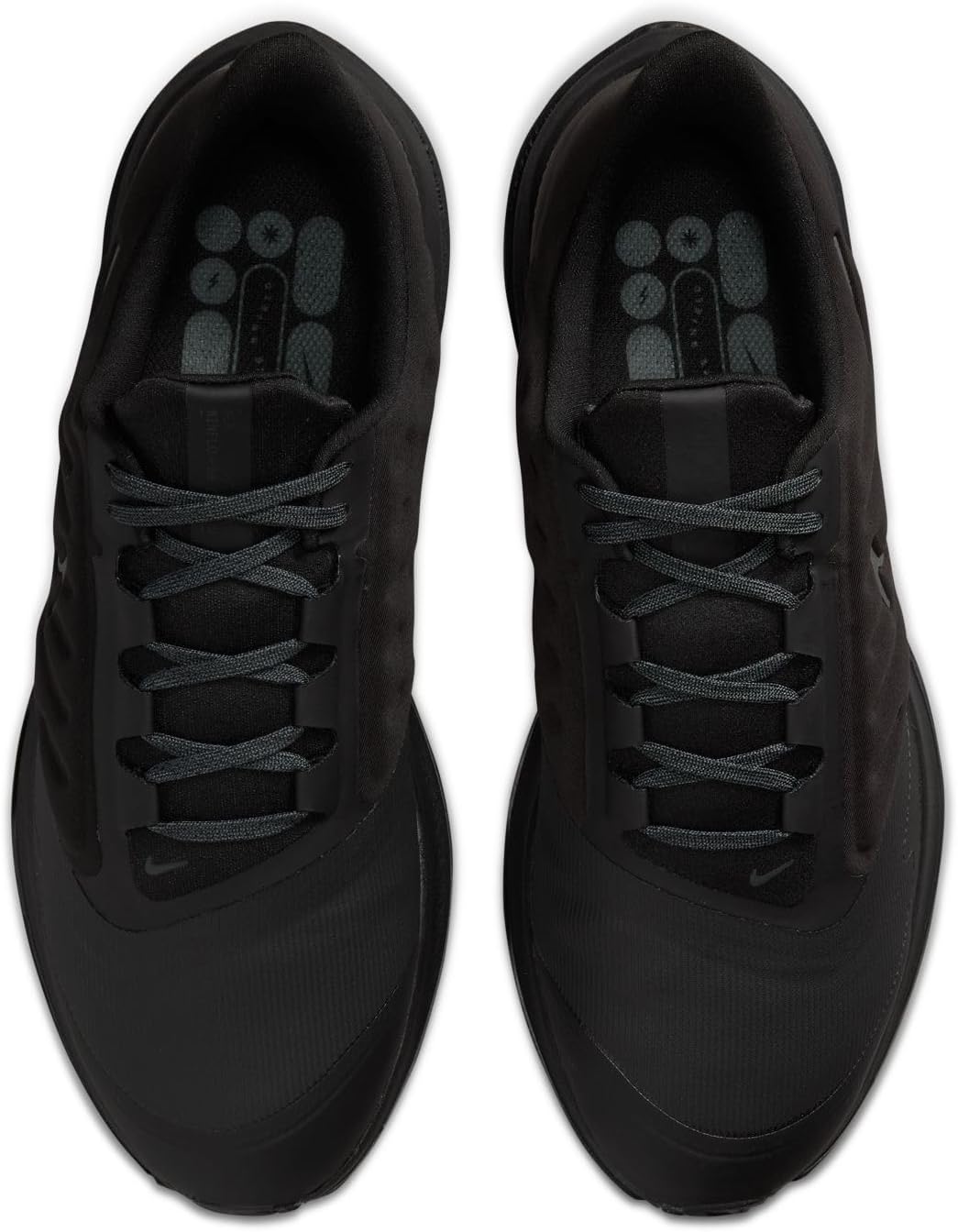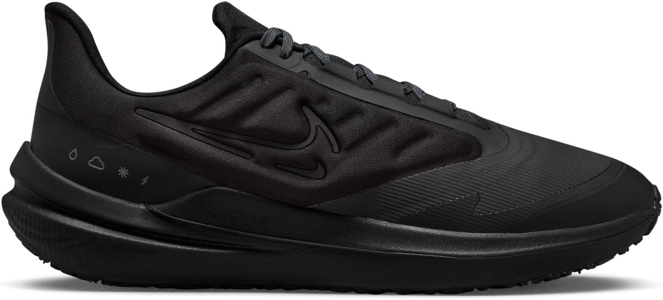 Nike Winflo 9 Shield мужские непромокаемые кроссовки для бега по шоссе Не позволяйте погоде помешать вашей пробежке. Бросьте вызов погоде с этой моделью, разработанной, чтобы помочь вам преодолевать препятствия и бить личные рекорды. Водоотталкивающее покрытие сохраняет вас сухими. Полноразмерное сцепление и вставка Air обеспечивают оптимальное сцепление и мягкую амортизацию для развития на скользкой поверхности. Тепло до пальцев Сетчатый материал верха обеспечивает оптимальное тепло во время пробежек в холодную погоду, как если бы ваши ноги были в тепле в куртке. Покрытие на носке расположено там, где может просачиваться вода, для защиты от влаги. Разработаны, чтобы оставаться сухими Водоотталкивающее покрытие и язычок с ластовицей помогают сохранить ноги сухими. Подошва Rain Grip Storm Tread обеспечивает исключительное сцепление в сырую погоду. Она имеет текстурированный рисунок, вдохновленный зимними шинами. Микроканавки цепляются за дорогу, а разнонаправленные формы отводят воду для прямого контакта с битумом. Оптимальная амортизация на протяжении многих миль Полноразмерная вставка Nike Air обеспечивает целенаправленную амортизацию. Мягкая и отзывчивая промежуточная подошва из пеноматериала обеспечивает лучшую амортизацию при каждом шаге. Утепление: комфорт. Утеплитель на задней части язычка обеспечивает абсолютный комфорт в верхней части стопы. Пестрая подкладка и структурированный утеплитель с внутренней стороны обеспечивают тепло и комфорт даже в неблагоприятных условиях бега. Подробнее: Этот товар не предназначен для использования в качестве средств индивидуальной защиты (СИЗ).