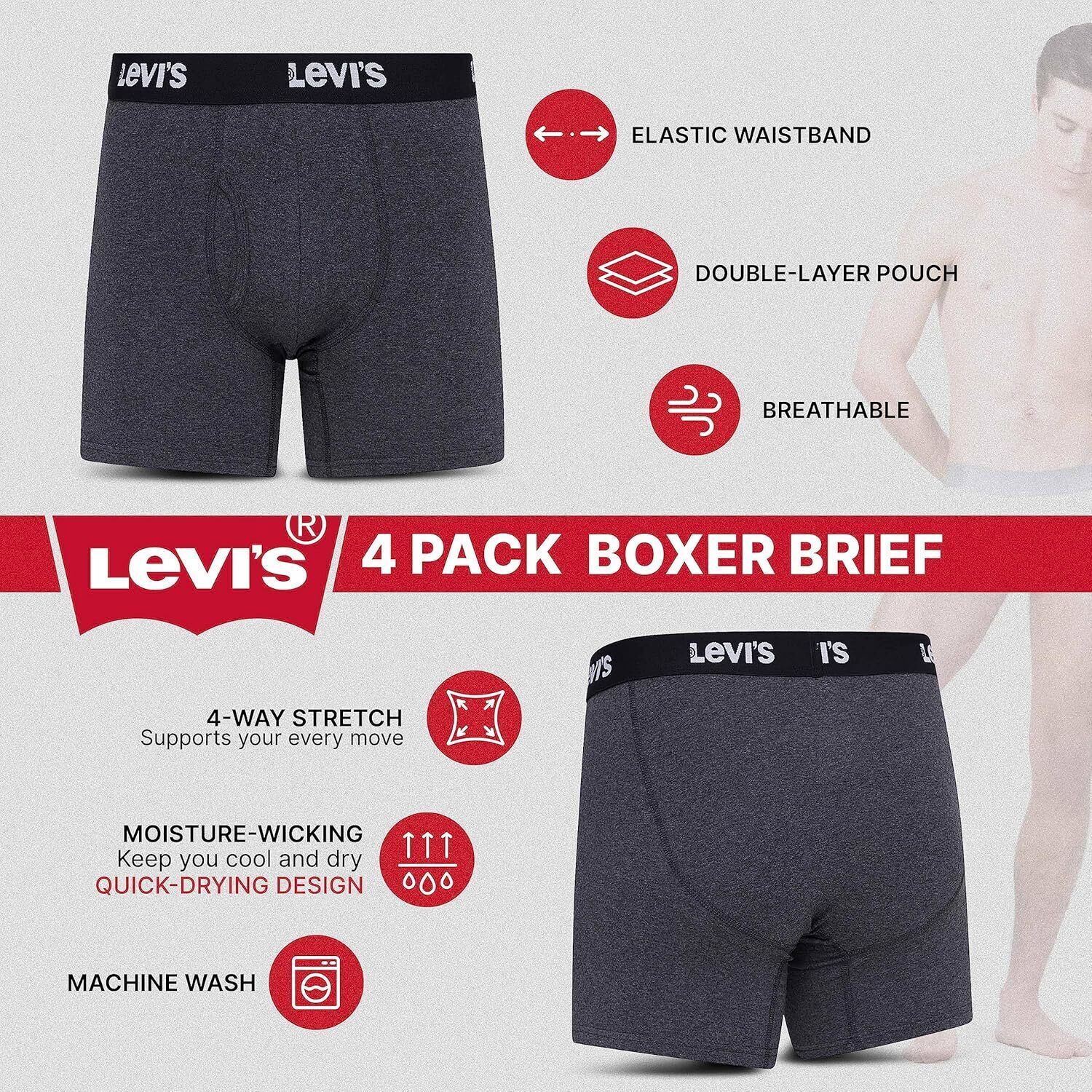 Мужские трусы-боксеры Levi's, дышащие, эластичные, 4 пары, Charcoal, Heather, Olive, Camo