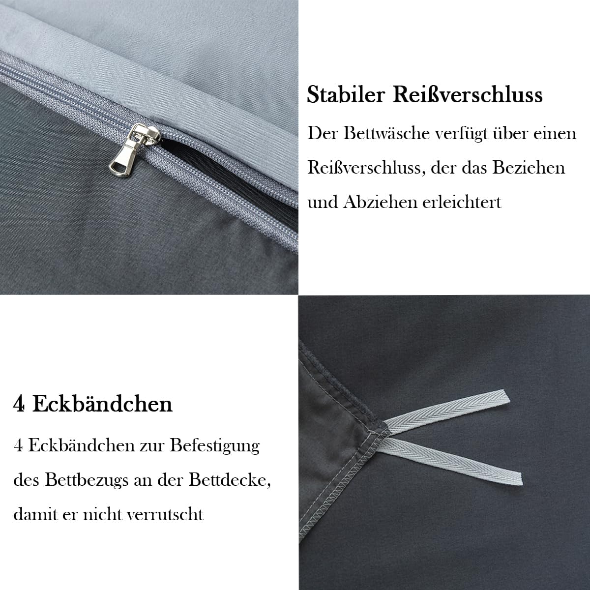 Молния: пододеяльник оснащен молнией, что упрощает его надевание и снятие. Наволочки также имеют молнию и идеально вписываются в общий дизайн. Чтобы одеяло оставалось на месте, по соответствующим углам предусмотрены завязки, которые позволяют прикрепить одеяло к пододеяльнику, и оно не будет сбиваться.