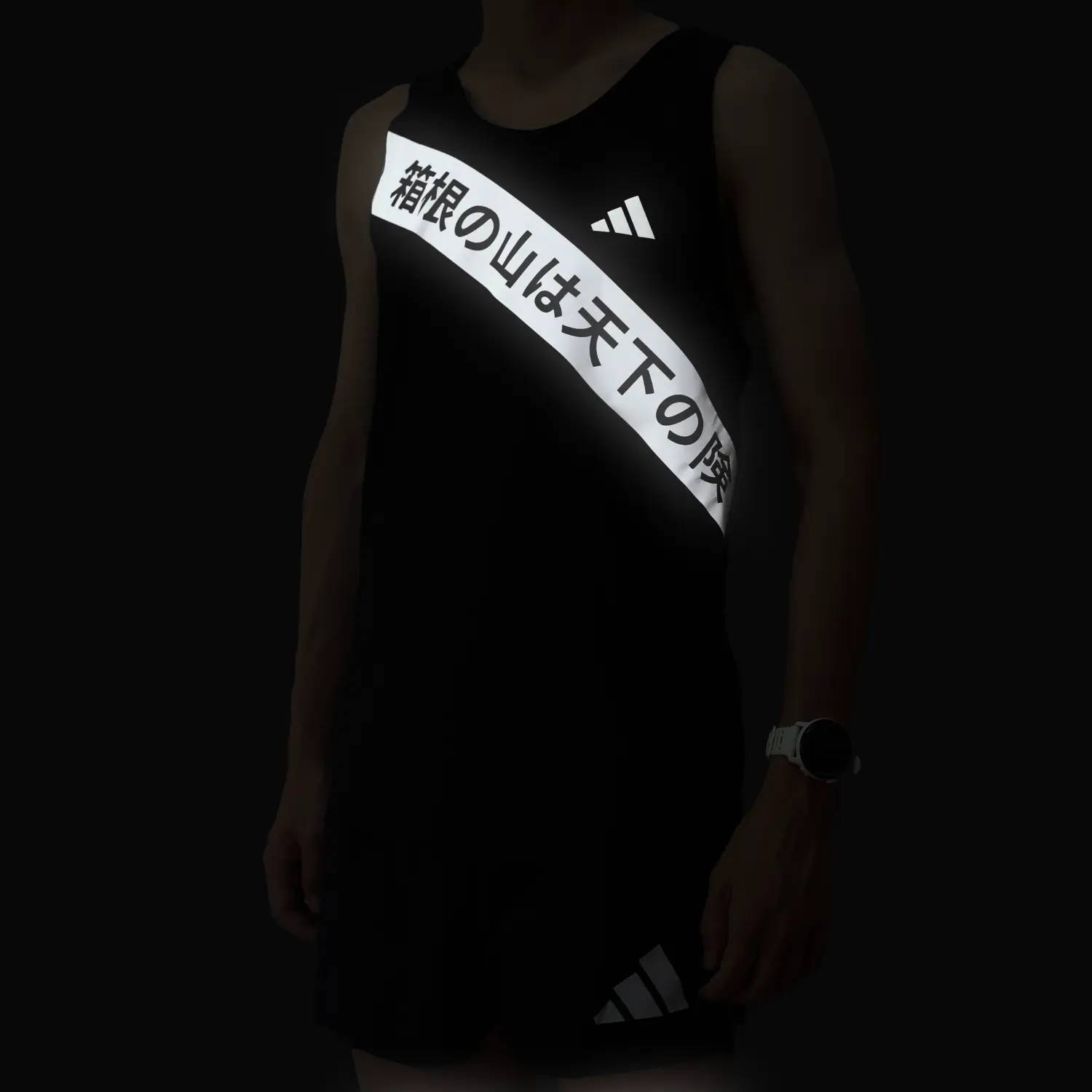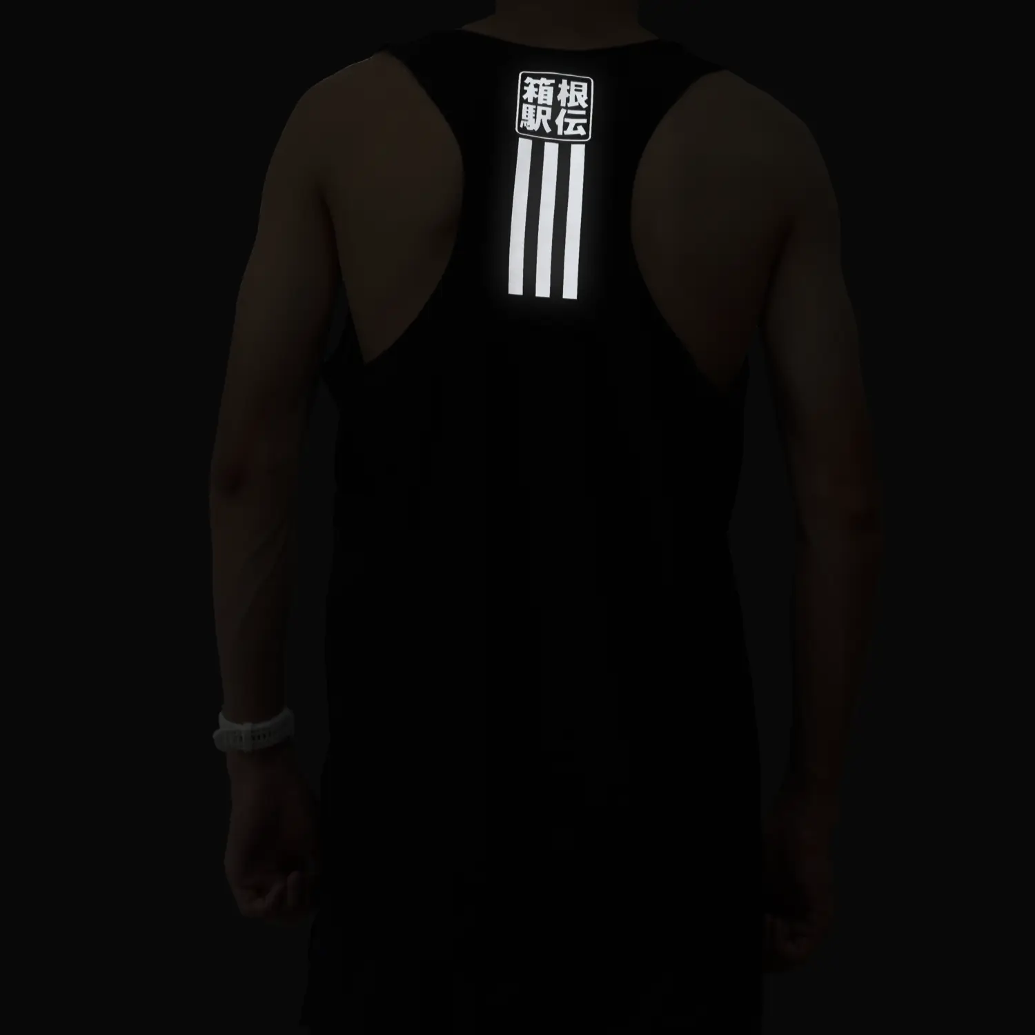 Эта одежда, разработанная на заказ, основана на оригинальной майке adidas Own the Run - чёрном мужском жилете без рукавов с круглым вырезом и тремя полосками на спине. Вдохновение пришло из забегов.