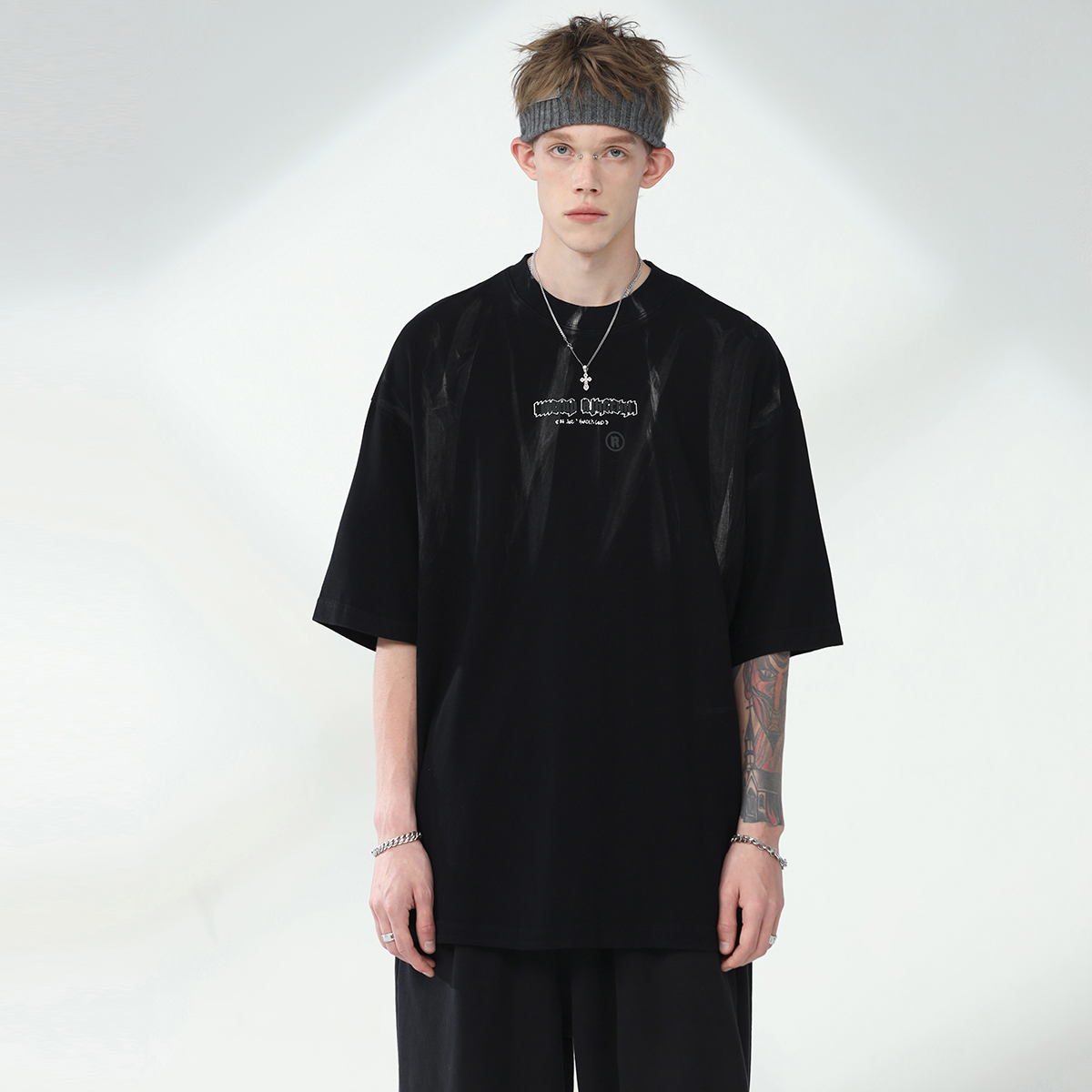Контрастный принт с логотипом на груди и частично выстиранная фактура создают выразительный художественный образ. Свободный крой oversize со спущенным плечом подходит для любого типа фигуры, предлагая большую универсальность и разнообразие стилей. Изготовленный из высококачественного синьцзянского хлопка плотностью 230 г, он мягкий, комфортный, дышащий и приятный к коже.