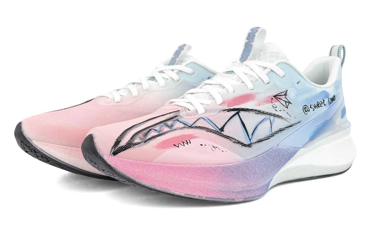 Эти кроссовки созданы на основе оригинальных мужских беговых кроссовок LiNing Chitu 8 PRO (стандартный белый. Это профессиональные тренировочные кроссовки с амортизацией, противоскользящим покрытием, износостойкостью, воздухопроницаемостью, лёгкостью и отзывчивостью. Дополнительный артикул - ARPV006-23. Бумажный самолётик на кроссовке напоминает воздушного змея, а слоган «Sweet love» передаёт нежное и романтическое послание, символизируя сердце, полное сладких чувств, свободно парящее по жизни, словно воздушный змей, в погоне за любовью и мечтами.